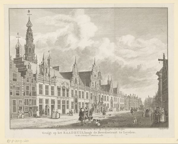 Editor: This print, "Magistraat van Kampen onderweg naar de keurpredikatie," made in 1761 by Simon Fokke, depicts a cityscape filled with figures in procession. I'm struck by the rigidity of the lines, the almost uniform darkness of the figures against the detailed buildings. What do you see in this piece? Curator: Beyond the cityscape and the procession, I see a potent visual statement about power and societal structures. Look at how the magistrates are depicted: marching in an orderly fashion towards religious ceremony, but it's important to question the historical context. How does this procession reinforce a particular hierarchy or social order? What impact do you think it had on marginalized groups within the city? Editor: I hadn’t thought about that. The orderliness made me focus on the artistry, but I see how the image is about maintaining a system. Curator: Exactly! We can view this procession as an instrument of power. Note the expressions, their clothes, and their posture. All of these things together are indicators of societal control, underscoring class differences of the time. Where does the individual fit into such an ordered system? Do you feel that the artist might be sympathetic to other views of the lower class in society? Editor: That is a lot to consider; maybe he didn't necessarily challenge the system, but he documents it. It is making me rethink what the role of art should be. Curator: Precisely. Understanding that tension is key. It compels us to grapple with how these systems are maintained, justified, and perhaps, resisted. Even seemingly benign genre scenes like this are products of power. They are deeply implicated in historical events, philosophical views and sociological impact. Editor: I now view it completely differently. Thanks. Curator: And that is exactly why it is great to look at things in a new way!