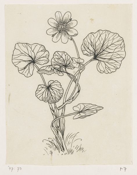 Editor: We are looking at “Hoefblad,” a pen-and-ink drawing on paper by Willem Wenckebach, made before 1893. The bold contrast between black and white really strikes me. What draws your eye, and how do you interpret this piece? Curator: What stands out is the work's direct engagement with botanical illustration, a field heavily shaped by both scientific inquiry and aesthetic conventions. This piece seems to operate in that liminal space. Are we looking at objective record, or something more interpretive? Editor: It's interesting you mention the line between record and interpretation. I can almost see a scientific precision but also a real appreciation of form. Do you see this drawing engaging with particular artistic movements of its time? Curator: Absolutely. We see echoes of Art Nouveau's preoccupation with organic forms and natural motifs. How might this botanical focus relate to broader cultural interests during the late 19th century? Was there, for example, a rise in botanical gardens or nature societies during this period? Editor: That's a good question! It does make me think about the social value placed on natural sciences at the time, and how art played a role in making them accessible. Perhaps this image also played in that space. Curator: Indeed. Consider the role of institutions like the Rijksmuseum. How does the presentation of such works within these spaces shape their meaning and reception? Does displaying a botanical sketch elevate it from a study to a piece of art, and what effect does that have on how the public interacts with art and nature? Editor: This conversation has shown me the subtle ways art intersects with scientific thought and societal values, even in a seemingly simple drawing. Curator: And I'm reminded that even within seemingly objective illustrations, artistry and cultural values invariably bloom.