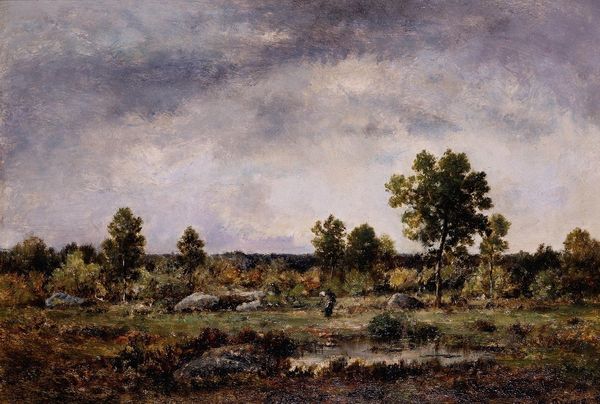 Johan Barthold Jongkind created this oil on canvas, La Campagne Nivernaise, in 1873. It embodies the Dutch artist’s move towards impressionism during his time in France. Jongkind’s rural scene depicts everyday life in the French countryside. The rough road suggests the difficult conditions of rural life, while the figures remain anonymous, emphasizing the universal experience of peasantry. The artist here engages with a long tradition of landscape painting, yet the focus on light and atmosphere represents a departure from earlier academic styles championed by institutions like the École des Beaux-Arts. The piece reflects a broader interest in rural life that emerged in France during the 19th century, amidst rapid industrialization and urbanization. Jongkind's loose brushwork and focus on transient effects of light prefigure the Impressionist movement, challenging the established art world. To fully understand Jongkind’s place in art history, one might turn to exhibition reviews from the period or correspondence between artists and critics. This painting reminds us that art is always situated within specific social and institutional contexts.