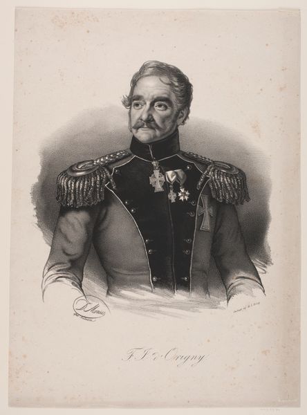 Nicolas Maurin created this print of Carlos María Isidro Benito de Borbón around the 1830s, likely in France. It depicts the Spanish Infante Carlos, a figure who embodied conservative resistance during a period of intense political upheaval in Spain. The image is striking for its detailed depiction of Carlos adorned with royalist symbols. This was a time of civil war in Spain, and portraits like this were tools of political propaganda. They served to legitimize Carlos' claim to the throne, visually encoding a set of social values tied to monarchy and tradition. Understanding this work demands that we delve into the institutional histories of 19th-century European monarchies. Scrutinizing period documents such as political pamphlets, newspapers, and even personal correspondence can offer a richer understanding of the print’s role. The image’s historical context reveals it as a potent symbol within Spain's turbulent socio-political landscape.