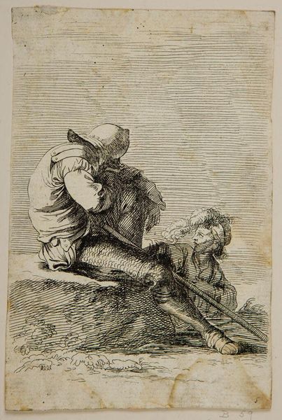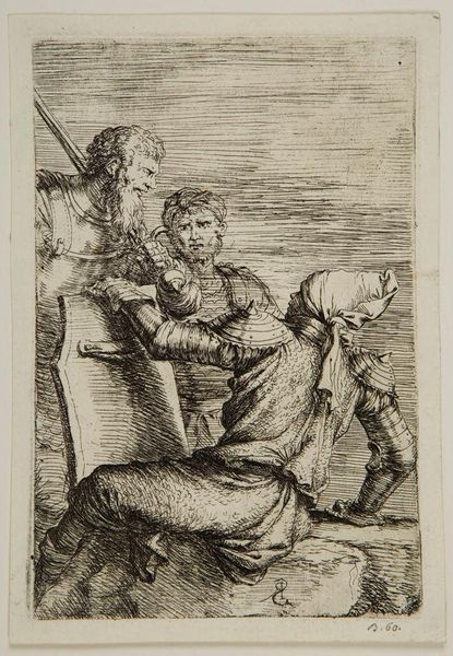 Curator: Salvator Rosa's "Seated Soldier Leaning on a Shield" presents a weary figure. It feels heavy, doesn't it? Editor: Absolutely. Look at the etching lines—they seem almost labored, mirroring the soldier's exhaustion. How does Rosa’s portrayal of military life challenge traditional heroic narratives, especially considering the tumultuous social context of 17th-century Europe? Curator: The printing process itself—the acid biting into the plate, the pressure of the press—speaks to the arduousness of labor, both artistic and military. We can think about the cost of war on the bodies of working-class soldiers. Editor: Precisely. And consider how the sword functions both as a symbol of power and as a tool of oppression, embodying the complex dynamics of class and warfare in Rosa's time. It's a powerful, critical statement. Curator: Seeing the materials and understanding their manipulations makes it more poignant. Editor: Indeed. This image resonates deeply as a critique of power, then and now.