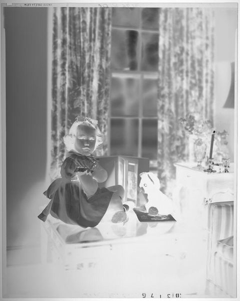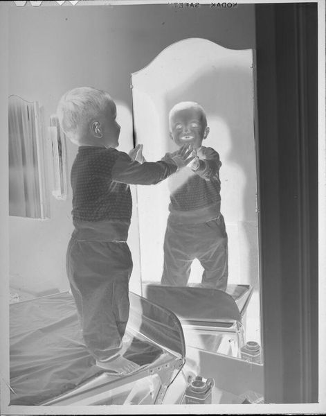 Curator: This photograph, an untitled work by Lucian and Mary Brown, captures a little girl looking intently at her stomach. It's small, just about 5x4 inches. Editor: It’s almost dreamlike. The inverted tones give the scene a sense of detachment, as if we're looking at a memory, or perhaps a moment of introspection. Curator: Absolutely. The photograph evokes a sense of curiosity and innocence. I feel that childhood is a time of wonder, and this image encapsulates that. The little girl seems lost in thought as she examines herself. Editor: I agree. There's something inherently political about the gaze, especially a child’s gaze directed at their own body. It raises questions about self-perception, societal expectations, and the ways we learn to understand our physical selves within the context of gender, race, and class. Curator: The image invites us to reflect on our own bodies and the stories they hold. What do we see when we look at ourselves? Editor: It's a poignant reminder of the complexities and contradictions inherent in the human experience. A powerful statement about identity, from within.