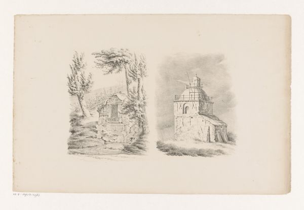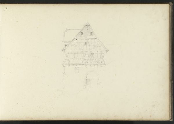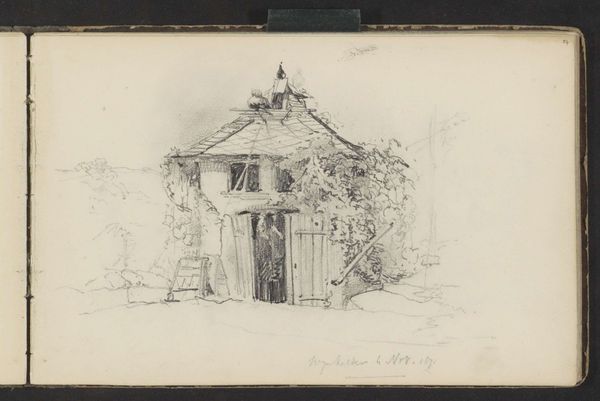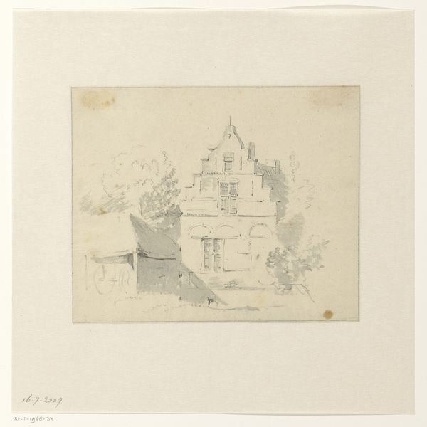 Curator: This sketch is entitled “Gezicht op huis de Borgel bij Deventer,” which translates to “View of the House Borgel near Deventer.” It’s a pencil drawing by Jan Striening, created in 1861. What strikes you about it? Editor: It feels like a half-remembered dream. Ghostly. You can almost smell the damp stone and hear the distant clip-clop of horse hooves on a cobblestone street. The aged paper definitely adds to that. Curator: The drawing captures a specific location and time. What’s fascinating is the interplay between the artist’s attention to detail and his somewhat Romantic sensibility, that gives it an ethereal quality. Editor: Right, you get a good sense of place, even though it is lightly sketched. I notice how the main building dominates the foreground. It’s so much detail compared to the sketchiness in the background around the outbuildings and the dog lounging by the cart! Curator: Observe the stepped gable of the main building—that ornamental flourish speaks to a desire to imbue even a functional farmhouse with a sense of grandeur and civic pride. We see these architectural details often used to signify status. Editor: Interesting. I’m also wondering if that is smoke rising from a chimney, it makes you imagine what life was like then, or rather, what the artist imagined it to be. Curator: Yes! Striening is carefully constructing a visual narrative that’s deeply rooted in a specific place. That little detail brings it alive. Even this landscape adopts symbolism that becomes timeless, as humans and temporality are involved in creating it. Editor: Well, I’m completely enchanted. I’m off to find my own Borgel. Thanks for helping me look closer! Curator: It was a pleasure. May your own artistic explorations be as fruitful!