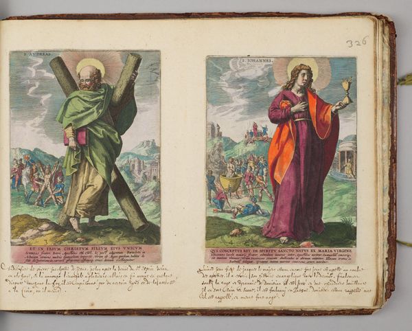 Editor: Here we have "Ibzan and Jephthah" by Hans Collaert the Elder. It looks like an illustration, maybe an engraving? I’m struck by the symmetry of the composition. What do you see in this piece, from a formalist perspective? Curator: The bilateral symmetry is indeed a primary structural element. Observe the mirrored poses of the figures, balanced by contrasting background elements. The formal tension arises from the interplay of line and color, each delineating distinct spatial planes. Note the restricted palette, almost emblematic in its usage. Editor: So the figures and the background are each defined by separate elements? It's quite striking. Curator: Precisely. The figures, rigidly defined, are opposed to the softer, more diffused rendering of the background details. The engraving technique itself contributes to the graphic clarity. Editor: That makes the symbolic nature of the composition much clearer now. Curator: Indeed, form dictates content in its purest expression here.