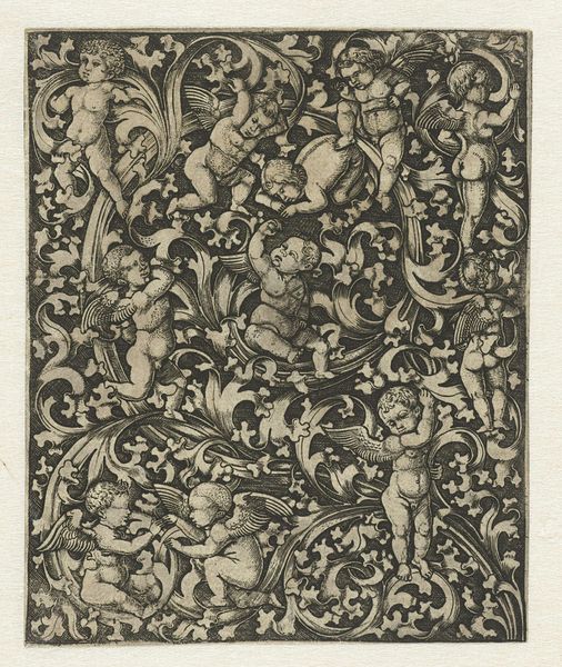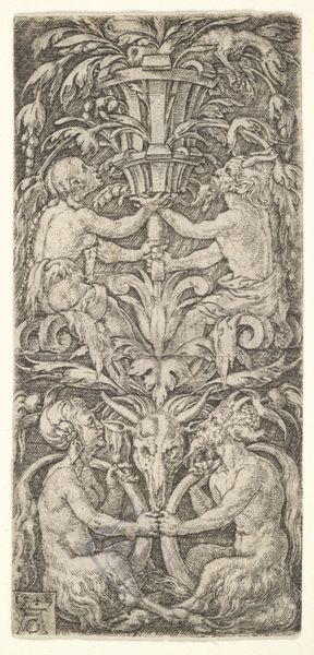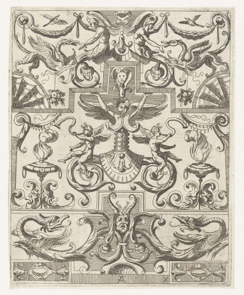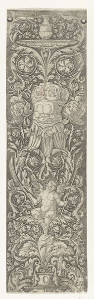 Editor: Here we have Heinrich Aldegrever’s "Vertical Panel with Inhabited Candelabrum Rising from a Cuirass," an engraving from 1553. It's incredibly detailed. All those fine lines… almost overwhelming. What do you see when you look at this piece? Curator: I see a confluence of materials and meanings, of power and production. This engraving, made with metal tools on a metal plate, displays the art of the armourer and the graphic artist in dialogue. The very process—etching, biting with acid—echoes the destructive potential inherent in armor itself. How fascinating that martial prowess becomes ornament! Editor: So, it's not just decorative? Curator: Not at all. It reflects a specific social context. Consider the armor: no longer solely functional, but a display of wealth, status, a symbol of power being consumed as art. Notice the intricate floral designs emerging from the cuirass. What statement is Aldegrever making about the relationship between warfare, luxury, and artistic creation? Editor: It's interesting to think of this delicate print being born out of such a forceful medium as armor. And the candelabrum as this sort of…flourishing of conflict. Is that right? Curator: Precisely. The labor-intensive process of engraving mirrors the craftsmanship involved in creating the armor itself. Both demanded skill, time, resources. It elevates craft, the process of *making*, to the level of art. Where do we draw the line? Who determines what is worthy? Editor: That really shifts how I see this! I was initially focused on the composition, but now I'm thinking about the cultural values embedded in the object itself and its making. Curator: Exactly! It's about decoding the social relationships, labor practices, and consumption patterns inherent in the artwork. To think about materials and process. That reveals hidden histories, doesn’t it?