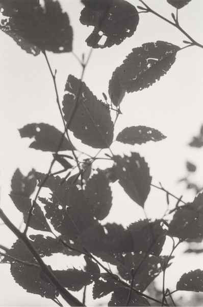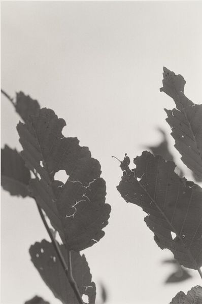 Curator: At first glance, this strikes me as rather…stark. Almost haunting. Editor: Indeed. What you're experiencing is part of Robert Adams’ work titled "Neahkahnie Mountain, Oregon," a photograph created in 2004. Adams often focuses on landscapes marked by human impact. Curator: Well, that explains some of the feelings. There’s such a strong dichotomy. You have the stark monochrome and the fragile, skeletal remains of these leaves. Each imperfection looks carefully composed, like little windows looking out into the stark void behind them. Editor: Adams’ photographs often act as documents, preserving fragments of an ecosystem while inviting the viewer to meditate on cycles of decay. Think of the use of organic shapes against a light background—it calls back to earlier botanical studies, a record, and perhaps a reflection of time. Curator: The "windows" might also represent nature’s resilience and resourcefulness – those missing bits tell a story of survival in progress, resilience despite adversity. Is there something inherently tragic in the life of things to be remembered, even if the symbol itself signifies decay? Editor: Certainly, these fragmented forms transcend a straightforward depiction. Adams seems intent on imbuing the common and discarded with dignity. Perhaps he wants us to remember the landscape is itself a story, layers of events accumulating in silent witness. Curator: You can't help but also note the impact of humans—like ghostly markers of intervention. Even within apparent ruination, the enduring beauty is somehow enhanced rather than diminished by their absence. It’s like looking at an empty stage, waiting for new dramas to unfold. Editor: What’s really intriguing is that the photograph is so simple in composition, almost deceptively so. A testament to finding significant and nuanced expression with very sparse ingredients. It might not immediately impress through scale or vibrant colours, it sneaks under your skin in a less forceful manner. Curator: True. Its effect accumulates with consideration—offering reflections on memory, change, and our place within an ephemeral yet continuous natural world. A fragile elegy of existence! Editor: Precisely. Hopefully, after examining its textures and subtleties, you now feel equipped to engage more thoroughly with its emotional and cultural resonance.