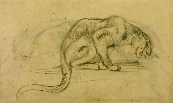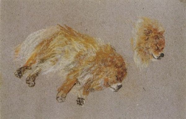 George Harvey's "Dogs" captures your attention with its minimalist composition and earthy tones. The arrangement of loosely sketched dogs on a muted background creates a sense of immediacy. The composition is strikingly simple: four studies of dogs are oriented differently on the page. This arrangement isn't about creating a realistic scene; it's about exploring the form and presence of the animal. The use of light and shadow is minimal. Harvey seems more interested in capturing the essence of his subject through line and shape. We might see how this piece destabilizes the traditional role of animal portraiture. Rather than idealized representations, we are presented with raw, almost casual sketches that highlight the animal's form. The semiotic value lies not in precise detail, but in capturing the essence of "dog-ness" through minimal means. Ultimately, "Dogs" functions as a study in form and perception. The simplicity of Harvey's approach challenges us to reconsider how much information is needed to convey the essence of a subject. It is a reminder that artistic meaning resides not only in detail, but also in suggestion.