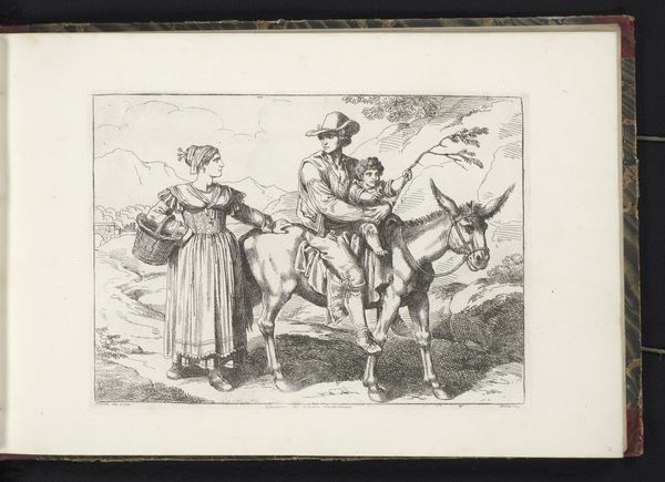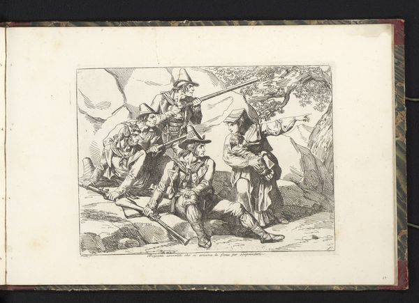 Bartolomeo Pinelli created this etching titled 'Jong bruidspaar dansend,' depicting a dancing bridal couple, its linear structure capturing a dynamic scene. The composition, rendered in monochrome, emphasizes form and movement. The eye is drawn to the couple, their figures animated by the dance, balanced by the musicians. The lines define not only the figures but also the textures of their clothing and the landscape, creating a visually tactile experience. Notice how Pinelli uses line weight to suggest depth, with the foreground figures more sharply defined than those in the background. This print engages with ideas of cultural representation, using the dance as a signifier of celebration and community. The precise, almost clinical lines, do not just depict a scene, but also invite questions about how culture is constructed through images and symbols. The strategic use of line and form serves not only an aesthetic purpose but also invites viewers to consider the deeper semiotic structures that shape our understanding of cultural practices.