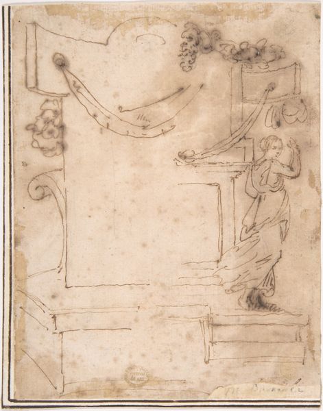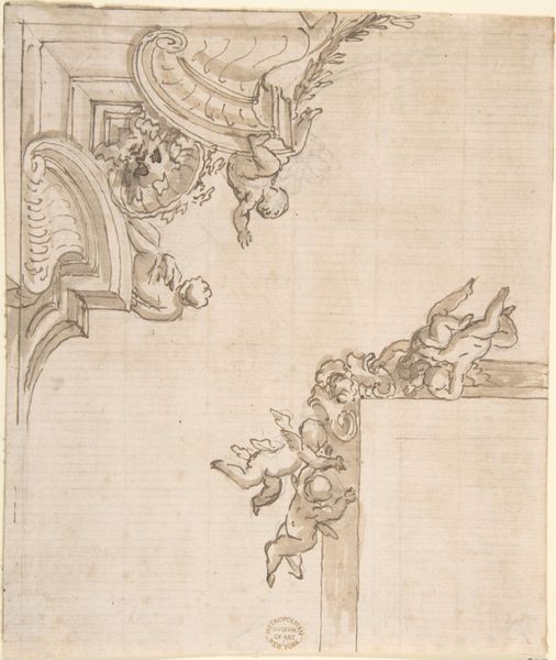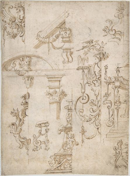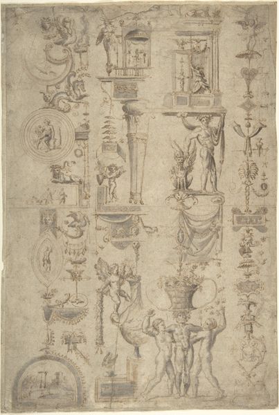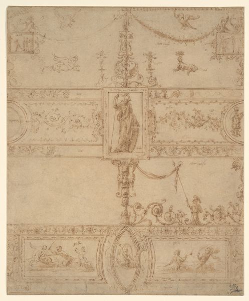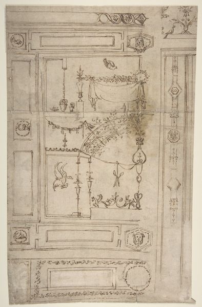 Curator: Let's consider this sketch—a "Wall or Cove Decoration"—created by an anonymous artist sometime between 1500 and 1600. It's currently housed at the Metropolitan Museum of Art. Editor: Immediately, it reminds me of those detailed architectural renderings from a period film. Intricate, slightly faded with age… you can almost smell the ink. What a feast for the eyes. Curator: Exactly. This Italian Renaissance drawing, rendered in ink, showcases a design for interior ornamentation. It probably served as a proposal for a wealthy patron. We see recurring motifs – figures, birds… Editor: Those muscular figures are fascinating. Sort of burdened and carrying, like ornate candle stands. Are they symbols of anything in particular? Curator: Potentially, but decoding Renaissance symbolism can be tricky! Given the context, it’s more probable these elements signified wealth, taste, and classical learning rather than specific allegories. They contribute to a display of power through artistic patronage. Editor: You know, what’s truly striking is its incompleteness. It feels like peeking into the artist's process. Did patrons get to provide notes or influence changes? Curator: Indeed. The state of incompletion makes it a great insight. Such drawings allow us to study not just the final artwork, but also the back-and-forth relationship between artists and their wealthy commissioner. It exemplifies how tastes and ideologies of influential people affected how Renaissance artistry evolved and what artistic messages were delivered. Editor: That incompleteness... leaves so much space for the mind to play. Like jazz. The solidness in the lower half then this space where all can exist, not like the finished, but the process. Curator: Precisely! That’s how sketches functioned during the Renaissance: ideas becoming artifacts, shaped as per design and context. Editor: It certainly is an inspiring glimpse into history. An incomplete window onto a world of creation.