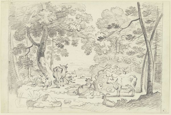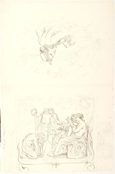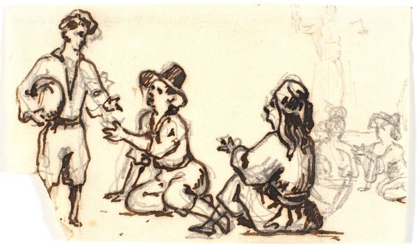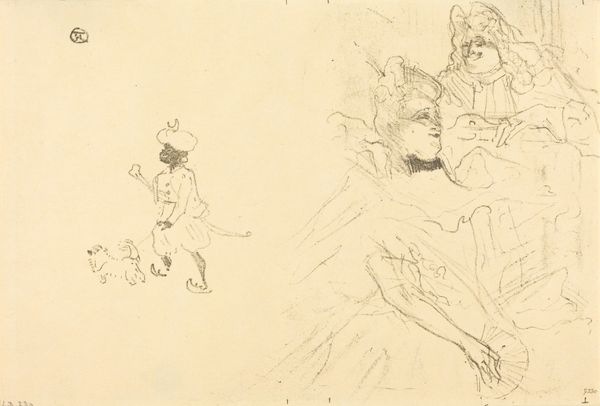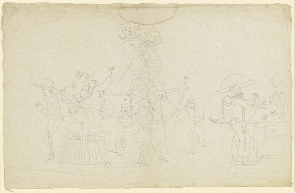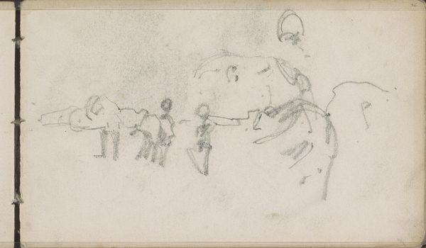 Curator: Okay, next up is "Comic Scene I." It's an undated drawing, done in graphite, ink, and possibly other mediums on paper, by George Cruikshank. Editor: Whoa! It looks like a page torn from someone’s wildly entertaining fever dream! Curator: It's all frenetic energy, isn't it? Cruikshank was a master of caricature. This scene is classic Cruikshank with those exaggerated expressions, bold lines. Notice how he uses line to suggest motion. Editor: Definitely see it, the linear quality really evokes old narrative traditions. Tell me, does the character on the right symbolize something specific? Curator: Given Cruikshank's penchant for social commentary, it is not a simple answer; although his imagery often leans into archetypes. He may be evoking political figures as devils in disguise. The comic grotesque exaggerates inner demons or moral failings for the artist. Editor: I like the horse is almost an afterthought. What's emphasized is the expressive interplay between those two characters and their frantic journey, right? This drawing manages to evoke fear and laughter almost simultaneously, but, to me, is it more a laugh at human folly. Curator: Perhaps a look in the mirror... Cruikshank’s lines create a chaotic dance. There is, I think, a lasting charm. He distills aspects of ourselves into figures of ridiculousness, forcing a reaction and perhaps a bit of self-reflection in the viewer. Editor: Well, that's an incredibly thoughtful thing to put so playfully! All those frantic strokes and sketchy shadows that make "Comic Scene I" more than a simple drawing, is one man's satirical take of life! Thanks. Curator: Agreed! He captures that human drama so succinctly, so accessibly, leaving us with a lasting grin.