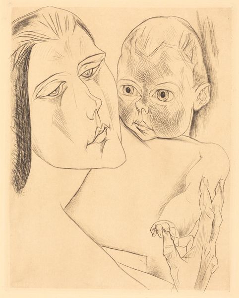 Editor: Here we have Heinrich Nauen's "Mother and Child," a striking drawing with an almost unsettling directness. The figures seem to be emerging from the paper itself. What do you make of the raw emotion captured here? Curator: It feels intensely personal, doesn't it? Nauen, part of the German Expressionist movement, often explored intimate themes, stripping away sentimentality. See how the angular lines convey both strength and vulnerability. It's a mother, but she also seems like a monument, worn down by her troubles. Editor: It’s the baby’s eyes that really get to me; they seem to stare right through you. Curator: Yes! A stark contrast to the mother’s downward gaze. Perhaps it’s about inherited burdens, a future already etched onto that innocent face. What do you think? Editor: That gives me chills. It's much more than just a portrait; it's a weighty statement. Curator: Exactly. Nauen invites us to confront uncomfortable truths about motherhood and the passage of pain. Food for thought, indeed.