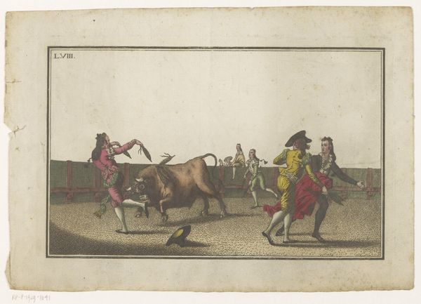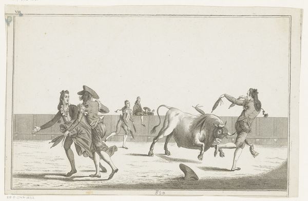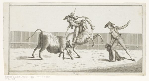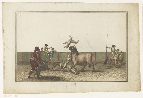 Curator: The focus of this image, an engraving called "Bull Attacked by Dogs" from after 1790, seems to be violence and spectacle, what do you observe? Editor: It's striking how dynamic it is for a print. You see the bull tossing a figure, the dogs in mid-lunge... It feels incredibly dramatic. What strikes you most about it? Curator: I’m particularly interested in the means of production, and how an image like this circulated. Who was the intended audience, and how did the engraver's labor translate the drama of a bullfight into a commodity? This isn't just about aesthetic representation, it's about the systems of patronage and consumption that supported this kind of artwork. Do you notice how the linear quality is really well executed here? Editor: Yes, the line work creates the illusion of movement really well, especially for an engraving. I’m wondering though, were prints like this purely for entertainment? Curator: Not entirely. The violence might be titillating, but think about the context: the ritualistic spectacle of the bullfight, the social hierarchies reinforced by it, the economic networks sustaining it. An image like this allows the upper class to revere a practice that relies on lower class people. We see how "high art" isn’t detached from brutal realities or production that required great effort. What do you think the symbolism suggests? Editor: That’s fascinating, I hadn't thought about it that way. I guess seeing the artwork framed as an item of consumer culture is challenging. Curator: It forces us to confront how art reflects and perpetuates societal structures and also consider who had access to these images. I guess that the labor, materials, and underlying economics cannot be disregarded. What have you found to be of value in our reflection about this print? Editor: I'll definitely be thinking more critically about the means of production and the social context. Curator: And hopefully, this way of looking will open further possibilities of analysis for your experience.