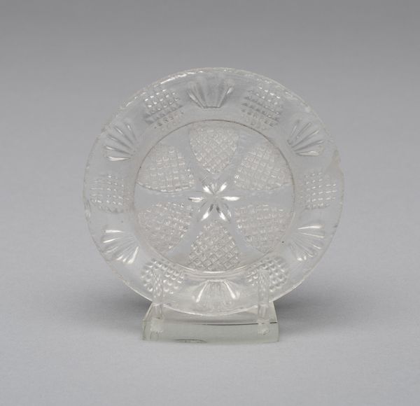 Curator: This lovely little object is a cup plate, dating from between 1830 and 1835. These were popular in the 19th century for holding teacups, to avoid drips onto the furniture, when drinking tea or coffee from a saucer. The artistry is by an anonymous maker. Editor: It has a fascinating crystalline quality. The scalloped edge gives it a playful almost lace-like, frame. There is something very inviting in the geometric circular patterns. Curator: Indeed. Think about the democratization of glassmaking at this time. The Industrial Revolution and new pressing techniques made pieces like this accessible to a broader segment of the population. This wasn't precious, bespoke glassware; this was part of a changing landscape in home economics. Editor: Right, it allowed for a play with light and form that hadn't been previously available, at least not so widely. The interplay of geometric squares along the rim contrasted against the circular form at the heart. Curator: It reflects a shift in social norms too, doesn't it? Etiquette manuals proliferated, teaching middle-class families how to participate in these newly formalized tea-drinking rituals. The plate represents a movement of upward social mobility. Editor: The glass itself appears almost alive. What the translucency of the glass provides in this example, you can find in architecture too, the way natural illumination transforms static forms into an animated subject of art. Curator: I’m drawn to how these decorative pieces allow us to investigate a tangible artifact, as well as the domestic life it participated in and the changing material culture of the early 19th century. Editor: And for me, the pure, geometric structure allows me to find elegance. Something enduring regardless of social trends, or their historical consequences.