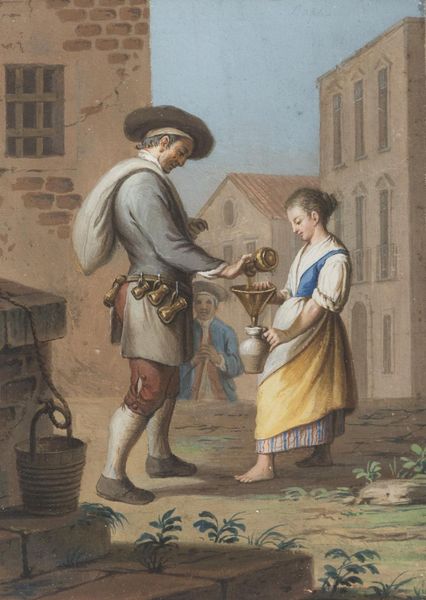 Curator: What a charming tableau! This is a watercolor entitled "Scene of daily life outside" by Saverio della Gatta. The figures and composition convey a lighthearted sense of movement. What do you notice first? Editor: The textures grab my attention, actually. Look at the bottle on the left, against the dancer's flowing skirt. It’s such an earthy still life countered against the performative space between the dancers. Curator: The juxtaposition works, doesn't it? It grounds the whole piece in the realities of daily existence. I wonder how the pigments available at the time influenced della Gatta's choice of hues—the specific shade of ochre for that skirt, for example. It’s almost as if the pigments themselves are characters in this rustic drama. Editor: It also makes me consider who the scene includes and excludes. A privileged artist painting what would have been an everyday moment, possibly romanticizing labor without participating in it. And look at how the women’s bodies are being presented through a male gaze. Even the landscape almost seems to push them into a pre-determined space to perform for the viewer. Curator: Interesting point! Della Gatta probably had access to the best paper and the highest-quality pigments, which speaks volumes about his social standing and how that might impact his romanticized perspective. Editor: Precisely. It's impossible to separate this lovely moment from the socioeconomic and political realities of 18th-century Naples. Romanticism and revolution weren't happening in a vacuum. Curator: Well, it makes one appreciate the layered context in this supposedly simple genre scene. Even something as basic as the artist's supplies holds layers of social and economic information. Editor: Agreed. Seeing through that lens transforms a pretty picture into a thought-provoking statement, intentional or not, about life and performance. It is still such a useful point of departure, even today.
