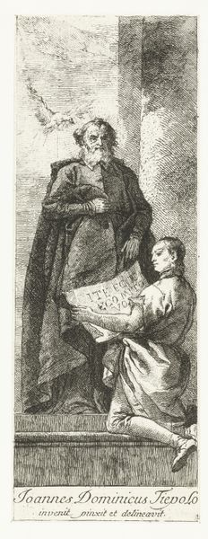 Editor: So this is "Dominicaanse heiligen Albertus Magnus en Thomas van Aquino," or Dominican Saints Albertus Magnus and Thomas Aquinas, made between 1623 and 1660 by Pieter de Bailliu. It's a pencil drawing on toned paper. It feels quite formal, almost like a staged photograph. What can you tell me about this work? Curator: Well, the formality you perceive isn't accidental. Consider the era: the Counter-Reformation. The Catholic Church sought to reaffirm its authority through art, and images of saints played a crucial role. Notice how Albertus Magnus seems to bestow knowledge upon Thomas Aquinas through a divine beam of light—a metaphor for theological succession, reinforcing the legitimacy of their teachings. What about their depiction strikes you? Do you see any visual cues about power dynamics? Editor: I see that Albertus Magnus is much taller and imposing. He's also older, with the papal mitre and dove hovering behind. It's as if Aquinas is receiving knowledge but is in a subordinate position. I wonder if this reinforces certain hierarchies within the Church? Curator: Exactly! Think about the societal implications: this image not only sanctifies religious figures, but also entrenches patriarchal structures and scholarly traditions that privileged certain voices over others. Consider how access to education and religious interpretation were largely restricted. How might this image contribute to a specific understanding of knowledge and authority? Editor: I guess it presents a very top-down view, where wisdom flows only from the established authorities to those deemed worthy. I hadn't really considered how actively images promote ideology like this. Curator: Precisely. These images weren't just decorative. They actively shaped social consciousness and power relations. Examining art through this lens enables us to critically evaluate the values that shaped, and continue to shape, our world. Editor: It’s definitely given me a lot to think about – seeing art as a way of both reflecting and reinforcing historical inequalities.