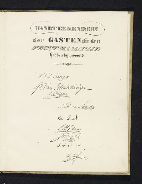 Curator: This is a program for a masquerade ball held by the Leiden student corps in 1865, created by J. Hazenberg Corns Zoon. It's a printed announcement, promising a reenactment of "The Entry of the Hollanders into Zierikzee, in 1304," with Jonker Willem, Grave van Oostervant. Editor: Immediately, I'm struck by the typeface. It evokes a strong sense of historical formality, doesn’t it? You can almost smell the ink and the aging paper, conveying a rich, if slightly melancholic, aura. Curator: The choice of script reflects the self-conscious historical romanticism popular in the 19th century. The masquerade itself—a bunch of Leiden students reenacting a medieval event—is rooted in historical reimagining, particularly narratives of Dutch resistance and identity. Editor: Yes, and "The Entry of the Hollanders into Zierikzee"—it evokes a sense of triumph, resilience. Given the date, I can’t help but wonder about the political subtext, how historical narratives were being employed to cement ideas around Dutch nationhood. Curator: Exactly. This performance wasn’t just harmless fun; it was a staging of national identity through a specific historical lens. The "Hollanders" as liberators, implicitly drawing a parallel to contemporary political struggles. How fascinating, also, that the commission mentions "regeling van de Maskerade." The act of regulating masking and masquerade suggests inherent social anxieties—concerns about order, authority, and the potential for disruption that always shadows such events. Editor: Absolutely. The price – "Prijs 25 Cents" – gives us a glimpse into its circulation and intended audience. I keep thinking about the figures present at this ball. The masked faces, the costumes, the performances, creating layers upon layers of symbolism and spectacle. Each detail likely alluded to complex social meanings, unspoken histories… Curator: This little program is a testament to how the past is never really past. It is continually performed, revised, and repurposed to speak to present concerns. A potent reminder that what seems like innocent spectacle is often a deeply coded assertion of power and identity. Editor: Indeed. Looking closely at even this one sheet of paper pulls back the curtain to reveal a past of constructed meanings and performative national identity. Fascinating.