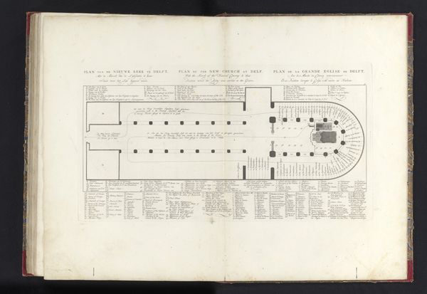 Curator: Let's examine this print titled "Plattegrond van de Oude Kerk te Amsterdam," a detailed floor plan of the Old Church in Amsterdam, dating back to 1765. It’s rendered in etching on paper by an anonymous artist. Editor: My initial impression is of cold geometry. There is a kind of sterile clarity, almost clinical. It reads less as a place of worship and more like a blueprint for power, a space meticulously carved out within a dense urban context. Curator: Precisely. The rigid lines and right angles articulate a visual language of structure. Note how the different chapels are labeled. There's a clear hierarchy established through spatial organization itself. Editor: Absolutely. And who were these chapels for? "Hamburg Choir," "Chancel of Saint Sebastian"... These spaces were often tied to specific guilds or social groups. The etching exposes a socio-political structure encoded in the architecture. One can almost see the divisions inherent in Amsterdam’s Golden Age society itself laid out here. Curator: That's a astute point. Also note the overall balance. There’s a rhythm in the repetition of columns, but there is this interesting curved apse at the Hooge-Choor or "high choir" offering a variation. It breaks the regularity of the rectangle, creating a focal point through its shape. Editor: I see that less as an aesthetic decision and more a strategic manoeuvre. It provides an optimal space for religious display. This diagram allows us to rethink how architecture facilitates the performance of ideology. How these physical spaces were designed to manage bodies and reinforce certain power structures. Curator: A provocative idea. Considering the history of the Oude Kerk, this print invites one to analyse its intrinsic design. The map illustrates the pure geometrical qualities of the place of worship itself. Editor: For me, the appeal lies in unearthing the church's place within Amsterdam’s cultural matrix and visualizing the interplay between space, power, and identity in this urban centre. Curator: Thank you, an alternate view, looking beyond the art’s composition to decode deeper layers of significance is crucial for comprehending visuality as a whole.