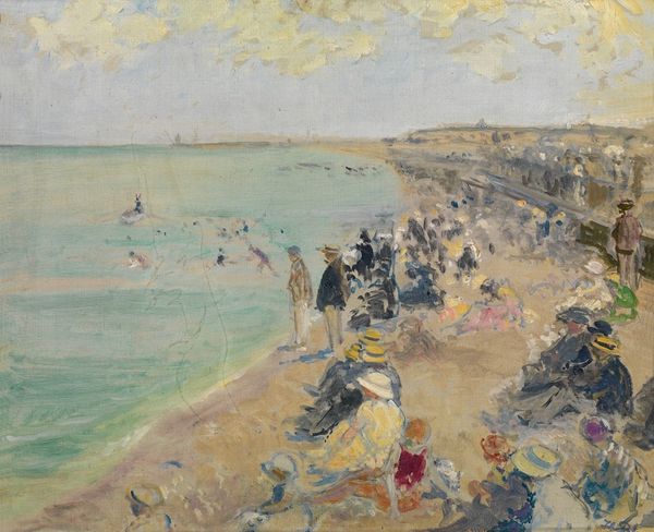 Rupert Bunny painted "On the beach (Royan)" with oil, layering sandy yellows and hazy blues. What strikes me is the way Bunny uses the paint almost like memory itself – soft, a bit blurry, capturing a feeling more than a photographic reality. Look at the seated figure reading her book, notice how the white dress seems to blend with the sand, making her almost one with the beach. The brushwork around her is loose, scumbled, and broken up, suggesting the shifting nature of light and the ephemeral quality of a summer afternoon. It's not about capturing every detail, but about conveying the overall sensory experience. This reminds me a little of Bonnard, who was also interested in capturing intimate, domestic scenes with a similar hazy light and focus on the emotional atmosphere. Bunny’s painting invites us to slow down, breathe in the salty air, and get lost in the dreamy atmosphere.
