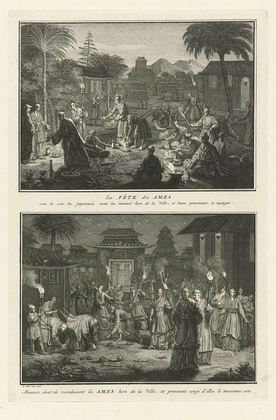 Curator: Looking at this print, titled "Verloving en Palmknopen" created around 1732 by Bernard Picart, I’m struck by the intricate detail he achieved through engraving. It seems to depict a formal gathering. Editor: It's rather dense, isn't it? A fascinating visual record of what seems like two different ceremonial settings. The light and shadow, though limited by the medium, really set a stage, almost theatrical. Curator: Exactly. "Verloving en Palmknopen," translating to "Betrothal and Palm Knots," portrays Dutch marriage customs. The top scene showcases the 'Verloving,' or betrothal ceremony. Note the couple seated on the bench as guests present gifts. The lower scene, the "Palmknopen," or Palm Knots, where wedding guests offer congratulations and likely tie knots in palm fronds as symbols of commitment. Editor: The "Palmknopen" scene is especially engaging. You can almost feel the excitement—or perhaps the tension—in the room through Picart’s renderings of body language. Look at how central the hand gestures are; what could they be indicating? And notice the contrast in spaces. High ceiling in the first scene vs lower ceiling and darker lighting of the second scene: What do you make of this deliberate construction? Curator: Those contrasts could reflect the different social dynamics, perhaps the transition from formal pronouncements to more intimate blessings. The use of engraving allowed for mass production of such imagery which makes you think: what are its functions beyond decoration? Perhaps to document and disseminate these marriage rituals for the burgeoning middle class? Editor: A valuable insight. We should remember engraving demands specialized skills and tools – copper plates, burins, and so on. The level of artistry isn't just representational but exists materially in the labor involved. Each line painstakingly etched. The consumption of this print itself becomes part of a wider economic network of artisanal craftmanship of the period. Curator: Precisely. Beyond its depiction of marriage customs, this engraving gives insight into the materials, labor, and distribution of art during the early 18th century, reflecting a period of social and economic change. It's more than just a historical snapshot; it’s an object deeply embedded in its own time. Editor: A compelling lens through which to understand both art and life during this era. Examining its symbolism in parallel with how it was made reveals just how multifaceted these artifacts really are.