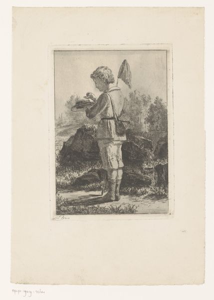 Curator: This engraving, simply titled "Huwelijk," which translates to "Marriage," comes to us from the workshop of Enea Vico, dating from sometime between 1533 and 1567. It’s an ink print on paper, currently residing here at the Rijksmuseum. Editor: Oh, look, it's lovely—delicate! It’s as if I stumbled upon a dream half-remembered from a Renaissance play. A lone figure… melancholy, perhaps? Though, those shackles around his ankles do suggest a rather less romantic reality. Curator: Precisely! Let’s delve into that. The technique itself—engraving—is crucial here. Vico, or those within his circle, used painstaking precision to carve these fine lines into a metal plate. This allowed for the reproduction and circulation of the image, effectively democratizing a particular ideal of marriage. Look at how that influences its understanding of love. Editor: Democratizing melancholy? I like that thought! Though, truly, those ankle shackles...it feels like some weird contradiction in terms: marriage presented as a freely entered bond while still seeming somehow enforced or restraining? Almost comical! And do you think he picked his cape to clash so magnificently with his... ankle wear? I see it now, as more than mere melancholy. It’s a sardonic, even witty commentary. Curator: Ah, but let’s consider the material constraints of the period. Paper was becoming more readily available, enabling this spread of visual culture, impacting how these unions were perceived, presented and thus participated in... Editor: Yes, of course! Mass producing little reminders of impending nuptial doom! But then, looking again at his face, there is the slightest smile playing about the lips. This artwork keeps pulling me in separate ways—like those conflicting vows we hear, 'to have and to hold’ and then you glimpse him, slyly calculating if the "hold" might someday include freedom regained. Maybe it’s not so somber after all. Curator: Indeed. Reflecting upon the engraving as a historical artifact reveals intricate networks of production, dissemination, and the complex negotiations surrounding gender roles of its time, providing an accessible and compelling visualization to a rather fraught sacrament. Editor: It leaves me pondering just how little some things truly change. I suppose the best marriages, like this fascinating print, have a dark little joke at their heart to keep you thinking.