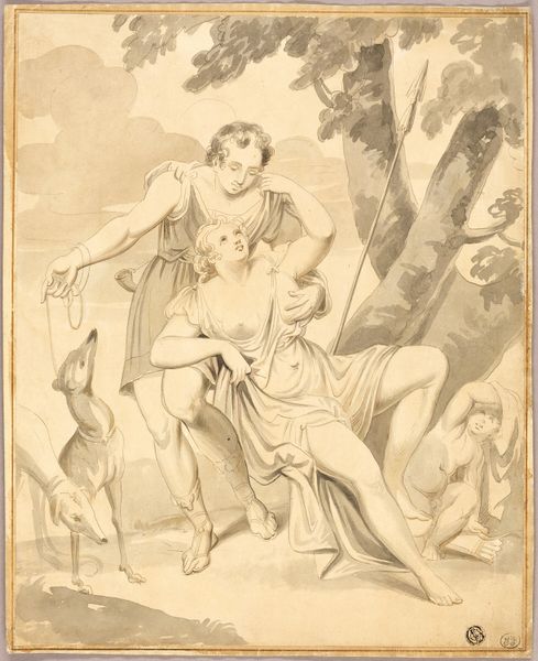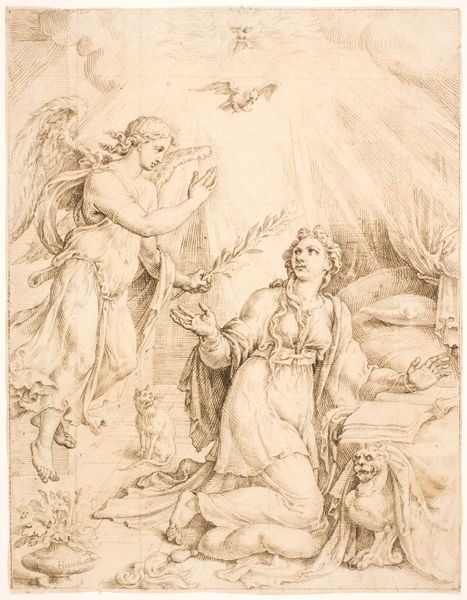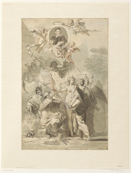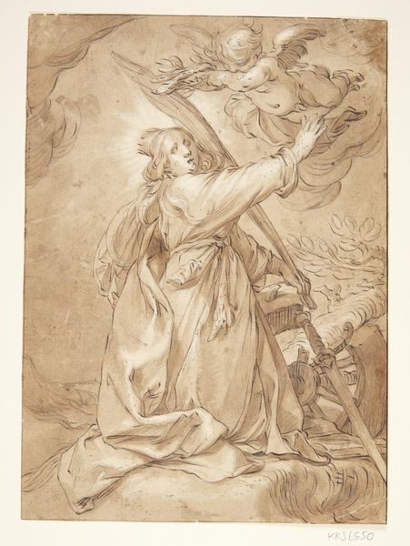 Curator: There's such a sense of gentle spirituality that emanates from this drawing—a kind of tender surrender. Editor: Indeed. What we have here is "Saint Anthony of Padua," an ink drawing attributed to Luca Giordano. It's a wonderful example of Baroque figuration. The use of brown ink gives it a warm, ethereal quality. Curator: It feels like a liminal space. Anthony, on bended knee, is surrounded by these cherubic figures, their forms dissolving into the light and cloud formations above. He's caught between the earthly and the divine, and you can feel it. What does his stance communicate to the faithful viewers of the time, do you think? Editor: Saint Anthony of Padua was often depicted experiencing visions. Given that this artwork likely functioned as a study for a larger painting, Giordano explores and shapes popular imagination related to Catholicism through these iconographic cues. The cherubs emphasize his connection with heaven. We see the very real negotiation between worldly authority and heavenly justice being shaped by imagery like this, by devotional practice and instruction. The Church needed convincing, memorable stories made visible. Curator: And, interestingly, those negotiations continue to reverberate today, shaping identity and social structure. What might this idealized, gendered portrayal tell us about who, historically, has had access to saintly status? About access to God and to grace? The visual emphasis placed on Anthony’s humility underscores broader expectations placed upon individuals of faith to demonstrate this subservience. Editor: Right. Think about how Giordano’s era helped solidify and visually proliferate such symbols. It's intriguing to consider who was viewing these images, their access to these visuals, and their effect on broader social interactions across class, location, and religious affiliations. The reproduction and dissemination of this devotional image mattered then, and its survival continues to matter now. Curator: Absolutely. This intimate drawing opens a doorway into a history still actively shaping contemporary realities. Editor: And reminds us that images always operate in a feedback loop: the social, political, and economic implications can ripple out far and wide.