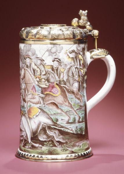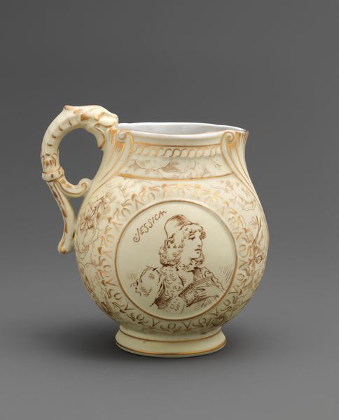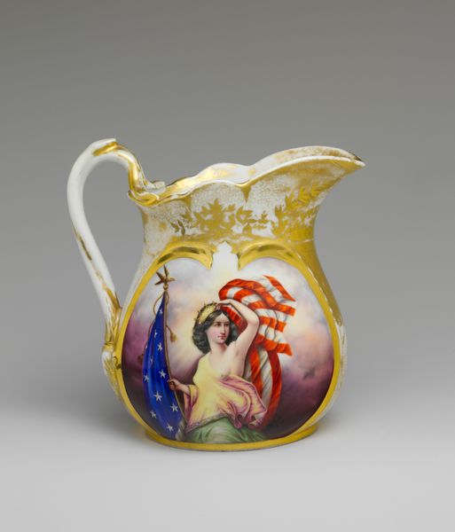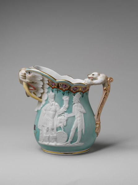 Editor: So, this porcelain jug, created in 1855 by George Edward Eyre, shows a scene in monochrome with red and gold embellishments. The depicted scene is quite somber. What do you see when you look at it? Curator: Well, immediately, I'm struck by the contrast between the high-art subject matter—the allegorical angel and narrative scene—and the mundane function of the object. A jug. Something mass-producible. The decorative-art style challenges traditional hierarchies. Editor: How so? Curator: Porcelain, historically prized, became increasingly accessible during the 19th century with advancements in industrial production. This piece blurs the lines between fine art and decorative craft, prompting us to question the social context of art production and consumption. Who was buying these jugs, and how did this imagery appeal to them? Was it meant for everyday use, or as a display of wealth and taste, mimicking higher forms of art? The scenes are possibly printed transferware which was an early process to add printed designs to ceramics through industrial printing. This raises interesting questions about artistic labor and its accessibility through reproduction. Editor: That's a really interesting point – how the process and material change the perception. I hadn't thought of the accessibility aspect. Curator: Exactly! Consider also the gold trim. It is both beautiful and serves as economic indicator about the item and the owner, if displayed publicly. Editor: I never would have looked that closely at a jug! I'm now curious about the whole porcelain industry in that period. Curator: It's a perfect example of how even the most seemingly decorative objects can be rich with meaning when we consider their materials and production.