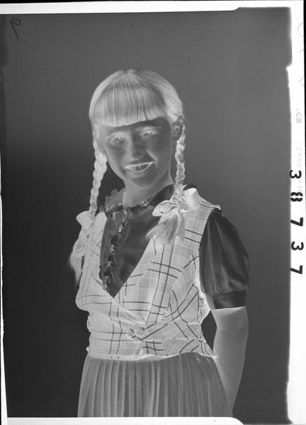 Curator: This intriguing silver gelatin print, attributed to Lucian and Mary Brown, presents an untitled portrait of a girl in a plaid dress. It measures approximately 12 by 10 centimeters. Editor: My initial reaction is one of slight unease. The stark tonality and the girl's somewhat fixed gaze create a rather unsettling, though undeniably compelling, image. Curator: I agree; the high contrast and lack of mid-tones certainly enhance the composition's emotional tenor. The dress pattern, with its rigid grid, introduces a certain order, perhaps symbolizing societal expectations. Editor: Exactly. Plaid, especially in mid-20th century America, signified conformity and a particular class identity. And consider the two framed artworks behind her, possibly chosen to shape the narrative of her identity. Curator: Quite possibly. The layering of these framed images and the subject herself invites a profound reading of constructed identity through the formal arrangement of the composition. Editor: An astute observation, focusing our attention on the portrait's intricate structure and symbolic depth. Food for thought. Curator: Indeed, a seemingly simple image yielding a complex web of meanings.