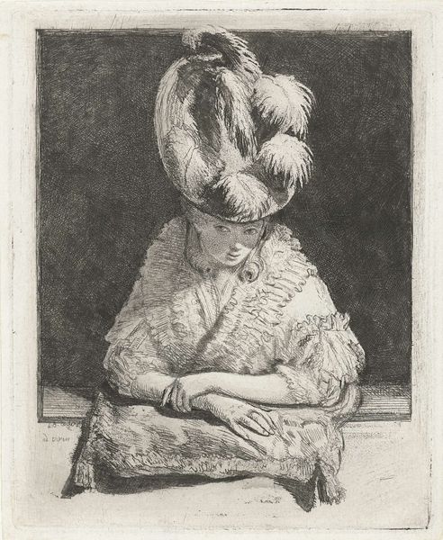 Louis Bernard Coclers made this print of a young woman with a hat looking out the window in the late 18th century. Here we see a young woman adorned in the height of fashion, seated at a window. But this is not just a portrait; it's a window into the social codes of the time. The elaborate hat and delicate lace shawl speak volumes about wealth and status in pre-revolutionary Europe. Coclers, working in what is now the Netherlands, was deeply embedded in a society defined by strict social hierarchies. The woman's gaze, directed outside, perhaps hints at a longing or a contemplation of the world beyond her privileged confines. As historians, we can delve into fashion plates and etiquette manuals of the period to fully decode the messages embedded in this image. Art like this reminds us that even seemingly simple portraits are rich with social and historical meaning, ready to be uncovered through careful research and analysis.