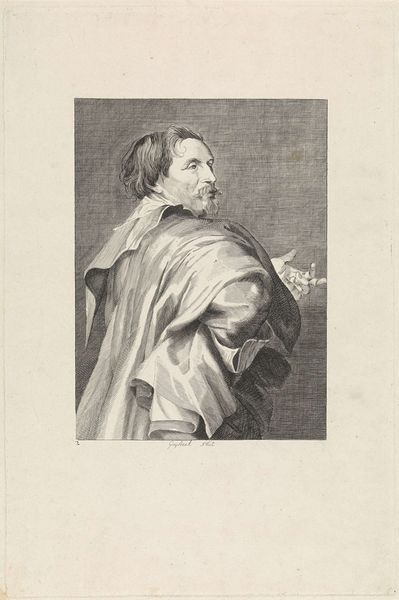 Editor: Here we have a fascinating engraving from 1831, entitled "Portret van de prentmaker Theodoor Rombouts," created by Pieter Romans. I’m immediately struck by the subject's piercing gaze and the detail etched into his drapery; it makes me wonder about his story. How do you interpret this work? Curator: Ah, yes. To me, this portrait whispers of hidden narratives and the quiet dedication of artists. Look at the lines—they’re not just describing form but feeling. The subject, gazing slightly off to the side, seems to be caught in a moment of contemplation, as if mid-thought, which invites me to daydream with him. Does his gesture feel a little theatrical, or perhaps warmly welcoming? Editor: I see what you mean about the gesture – a theatrical welcome perhaps? It almost seems like he's caught mid-sentence, making a point! Do you think Romans consciously tried to capture that liveliness in a static medium like engraving? Curator: I think so. The greatest portraits are those that transcend the mere physical likeness, offering a glimpse into the subject's soul or spirit. This print does that beautifully. It’s not just an image; it's an evocation. Don't you think it almost feels like a fragment of a much larger untold story? Editor: Absolutely, I’m suddenly incredibly curious about Rombouts and his work. Thanks, that's given me a lot to consider. Curator: My pleasure! Sometimes the most intriguing art is that which leaves us with more questions than answers.
