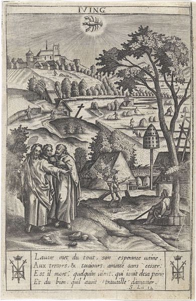Jan Gerritsz Swelinck created this engraving, titled "Maart," sometime in the early 17th century. The scene presents a juxtaposition of labor and religious guidance within a detailed landscape. It invites us to consider the social fabric of the Dutch Republic at the time. The print's imagery creates meaning through visual codes and cultural references. The figures to the left are working the land, while the figures to the right and in the middle appear to be discussing religion. This juxtaposition speaks to the economic and religious dynamics of the time, where the Dutch Republic was experiencing a period of prosperity and religious reformation. The image might comment on the role of the church in the lives of ordinary people or on the relationship between labor and faith. Understanding the social context of "Maart" requires historical research. Examining economic records, religious texts, and other cultural artifacts can help us better understand the artist's intentions and the work's place in society.