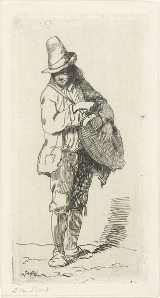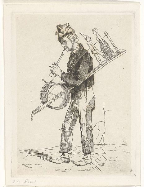 This small etching presents a street musician with a barrel organ, created by Jacobus Ludovicus Cornet in the 19th century. During this time, rapid industrialization led to significant social changes. Cornet captures a figure who ekes out a living through street performance. The man’s humble attire and the weight of his instrument suggest a life marked by hardship. Street musicians occupied a precarious position in society, often viewed with a mix of pity and disdain by the middle and upper classes. They represent one of the many disenfranchised groups in a quickly modernizing world. The print offers a glimpse into the everyday lives of the working class, reflecting on the dignity and resilience of individuals navigating economic challenges. Cornet’s image serves as a poignant reminder of the human cost of progress.