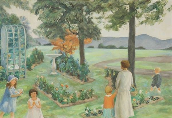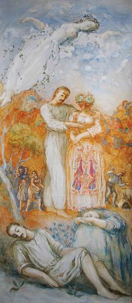 John Duncan created 'The Coming of Bride' around the turn of the twentieth century, but the exact date and the medium are unknown. It is an intriguing image that invites us to delve into the cultural imagination of Scotland at the time. Duncan was part of the Celtic Revival, a movement that sought to recapture a sense of national identity through folklore, mythology, and the Gaelic language. Duncan’s painting evokes a pre-Christian past through its depiction of Bride, or St. Brigid, an Irish Goddess and Saint associated with spring, fertility, and healing. She is surrounded by children and young women in a blossoming landscape, suggesting a renewal of life and a connection to the land. To understand the painting fully, we need to research the social and political context of Scotland during this period, looking into the history of the Celtic Revival movement and the ways in which it shaped the production and reception of art. Through this historical lens, we can appreciate the work as a reflection of its time and a powerful expression of cultural identity.
