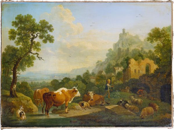 Dirck van Bergen painted this scene of herdsmen and cattle near a tomb sometime in the second half of the 17th century, using oil on canvas. The smooth surface belies the process of layering and blending that van Bergen would have employed. Think about the source of his pigments: minerals ground to a fine powder, mixed with linseed oil, each brushstroke a deliberate act. The canvas itself, stretched tight, provides a receptive ground for the illusion he creates. Van Bergen was part of a long tradition of landscape painting, but he also brings to it a distinct awareness of classical motifs. Note the tomb, adorned with what looks like a classical relief. The figures are frozen in stone, a stark contrast to the earthy, visceral reality of the herdsmen and their animals. This wasn't just about pretty scenery; it was about placing everyday life against the backdrop of history and mortality, a rumination on the passage of time itself.