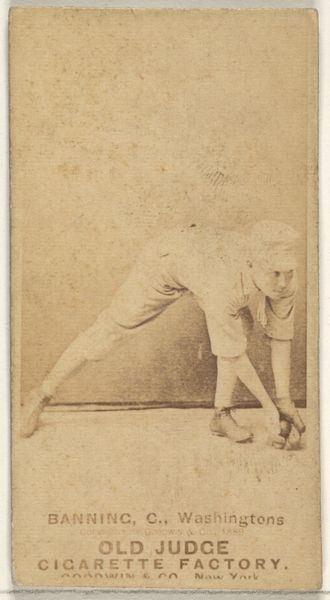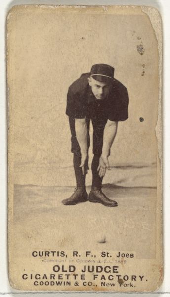 Curator: We’re looking at a fascinating artifact of late 19th-century American culture: a baseball card featuring Frank Scheibeck, a shortstop for the Detroit Wolverines. The card comes from the Old Judge series, N172, produced in 1888 by Goodwin & Company as advertising for their Old Judge Cigarettes. Editor: It’s the sepia tones that first grab me—almost dreamlike. The pose, too, feels surprisingly vulnerable. He’s crouched, lacing up his glove. It is a powerful study of ritual before action. Curator: Precisely! These cards were immensely popular and contributed significantly to the commercialization and popularization of baseball. The image helped cement baseball as America's pastime. The mass production of these images is crucial to consider here. Editor: I find it compelling how this photograph elevates the simple act of preparing for a game into an almost iconic gesture. The laced gloves are visually reminiscent of bound feet in old East Asian cultural artwork, an oblique symbolism relating to the player being about to engage fully in something greater. Does the lacing action represent this player binding himself in spirit? Curator: An interesting take! I lean more towards considering this from the lens of production, consumption, and baseball’s transformation into a major commercial enterprise. It highlights how corporations shape national pastimes for profit. We shouldn’t forget this photograph lived in a series of many identical others. Editor: Of course, but consider the implications. Scheibeck and his baseball equipment take on added layers of meaning; in a way, they encapsulate the values of the era itself - diligence, preparation, and the looming potential for action within the rigid confines of established play. It gives him an aspect larger than any Detroit player, even still to this day. Curator: Yes, while appreciating its artistry, we must also remember the political economy around its creation and the fact that advertising for harmful products made this photograph available to so many consumers. Editor: A fair and needed reflection, certainly, reminding us to carefully engage these nostalgic echoes from the past.