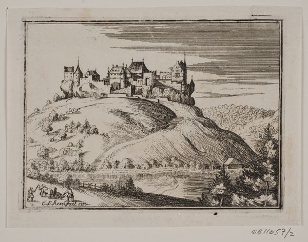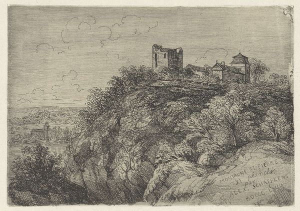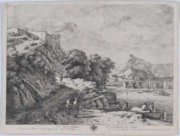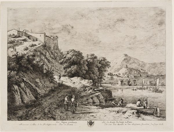 Curator: This is "Gezicht op La Voulte-sur-Rhône," an etching and engraving created around 1854. What's your first impression? Editor: Austere, almost... cold. The linear quality and the stark contrast give it a sense of distance, despite the bustling figures in the foreground. Curator: It's a view of the town itself, really an imagined reconstruction focusing less on realism and more on capturing the town's identity and socio-economic place on the riverbanks. Look at the boats – signs of trade and commerce. Editor: Absolutely, but the artist also utilizes line weight masterfully. Thicker lines define the foreground, anchoring the boats, while the town recedes into finer, lighter marks. This dictates the sense of spatial depth, using only tonal value. Curator: Right. Consider the economic forces at play during this era, think of the labour behind creating and trading such prints; how were these images circulated, and consumed, influencing the public's perceptions of place and identity? Editor: All true, but I'm equally struck by the visual vocabulary. The deliberate cross-hatching generates texture suggesting stone, water, even foliage, through purely abstract means. How this conveys visual information independent of what the reality would look like to the eye. Curator: Yes, it points to larger economic realities and how the artist uses the industrial methods available at that time to reach wider audiences. It's about the act of disseminating views like this that informs us more broadly. Editor: Perhaps. Still, that interplay of dark and light—it directs the gaze, creates dramatic highlights on the architecture, that's all fundamental visual story-telling. Ultimately it makes for a pretty memorable piece. Curator: Exactly. A compelling, useful window into a moment of industrial production and material transformation within a certain landscape. Editor: I find it truly revealing how close observation can generate divergent conclusions.