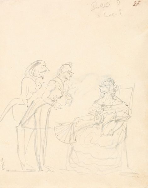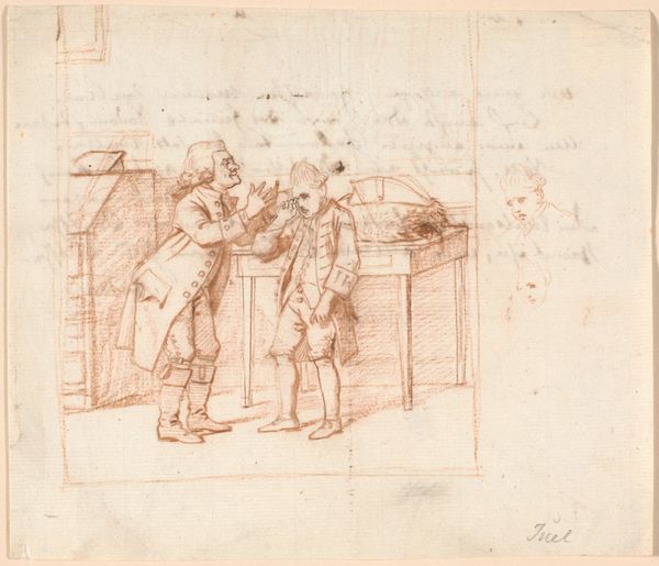 Nicolai Abildgaard made this drawing with graphite on paper. The composition, a tightly framed scene, focuses on two male figures engaged in conversation within an interior. Abildgaard uses a linear style, with hatching defining the forms and the space. Note how the artist uses line work to construct not just the figures, but the furniture and architectural elements. The standing figure, rendered with a degree of lightness, contrasts with the more assertive, seated figure whose gesture commands attention. The drawing's aesthetic lies in its sketch-like quality; Abildgaard captures a moment, implying a narrative through posture and expression. The sketch shows us the artist's process of refining and exploring his composition. The interplay between the figures and their environment destabilizes the simple setting, inviting the viewer to consider the social and political context, as well as the personal dynamics.