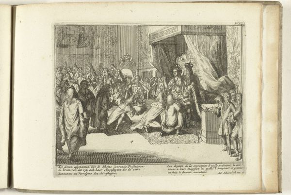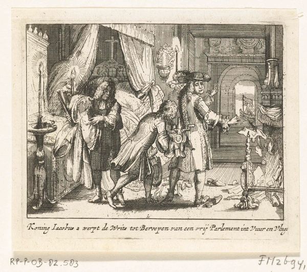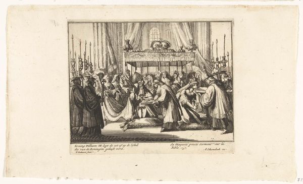 This engraving, created by an anonymous artist in 1689, depicts William III and Queen Mary receiving the Scottish crown. This event marks a pivotal moment in British history, following the Glorious Revolution of 1688. Note the power dynamics at play; with representatives kneeling before the new monarchs offering the crown. The image speaks to the transfer of authority and the negotiation of power between Scotland and the newly instated English rulers. Consider how gender is visualized here. As a female monarch, Mary's position challenges traditional patriarchal structures, yet she rules jointly with William, complicating conventional notions of female power. This reflects a shift but not a dismantling of gender roles in governance. This print captures a moment of political transition, one that invites us to reflect on the complexities of power, gender, and national identity in the shaping of British history.
