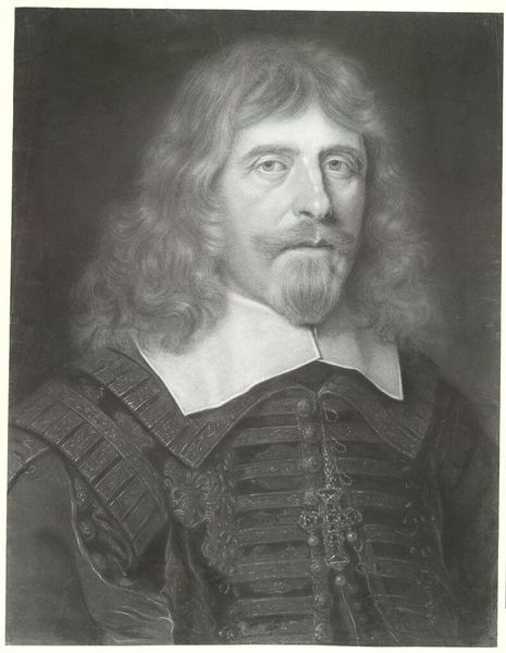 Curator: Wallerant Vaillant, a Dutch Golden Age artist, likely produced this portrait of Hugues de Lionne in the mid-17th century. Editor: The sitter’s gaze is direct, but there is a palpable sense of melancholy in his eyes. The grayscale lends it a timeless, almost ghostly quality. Curator: Vaillant was known for his mastery of the mezzotint technique, a printmaking process that allowed for rich tonal variations. This portrait exemplifies that, doesn’t it? Editor: Absolutely. And when we consider Lionne's role as a French diplomat during a turbulent period, one imagines the weight of political decisions etched on his face. Was this portrait intended to convey power or perhaps a more human vulnerability? Curator: The prominent display of his order likely served to reinforce his status, fitting into a tradition of portraying influential figures. Editor: Perhaps, but I am more intrigued by what remains unseen. What sacrifices did Lionne, as a man of power, demand of others, and even himself? Curator: It's a reminder that even seemingly straightforward portraits are complex documents of history and identity. Editor: Indeed. And this image invites us to consider power, and its toll on those who wield it.