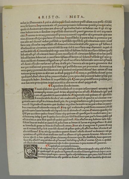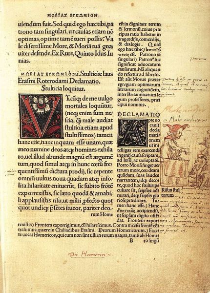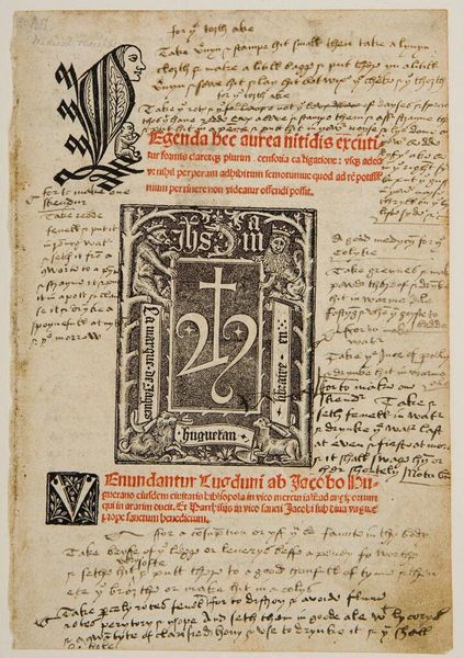 Curator: Look at this striking illuminated page. It's an initial "M" from Lactantius' "Divinarum Institutionum," printed in Venice between 1492 and 1510. Editor: It has such a somber, almost grave tone. The red ink creates a stark contrast with the densely packed text, and it feels very weighty, like it's guarding some profound secret. Curator: The "M" is filled with figures, possibly allegorical representations central to Lactantius' arguments against pagan beliefs and defense of Christian doctrine. It's important to remember the context: this was printed during a time of intense religious and intellectual debate. Editor: So, the imagery within the letter acts as a symbolic threshold, inviting the reader into a world of religious discourse, with figures embodying the tensions between faith and what was then considered paganism. Curator: Precisely. This text aimed to reshape societal understanding of faith, morality, and governance in the face of Roman imperial power. Editor: Reflecting on it, the use of symbolism in the initial "M" feels like a microcosm of the larger cultural shifts, the tension between the old and the new ways of thinking. Curator: I agree; it highlights how religion was being reshaped, defended, and promoted through the printed word, impacting our current understanding of power, faith, and culture.