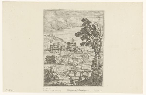 Pieter Langendijk created this river landscape with church using etching techniques. The composition is dominated by the interplay between architecture and natural forms, where buildings are rendered in meticulous detail, contrasting with the more freely depicted foliage and landscapes. Notice how Langendijk manipulates light and shadow through dense, fine lines to create depth and texture. The buildings and the skeletal tree on the right serve as visual anchors, framing the composition and guiding our eye through the serene waterway towards the distant mountains. This etching reflects the artistic interests of the 18th century, where there was an increasing interest in landscapes and the picturesque. Langendijk's work embodies the period's fascination with structured yet romantic views of the natural world. Through line and composition, the image captures a nuanced sense of space.