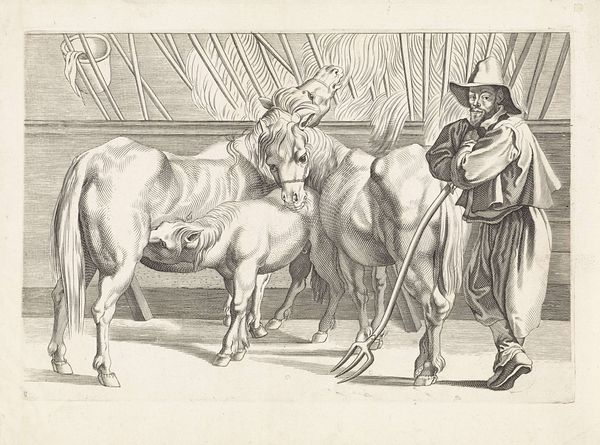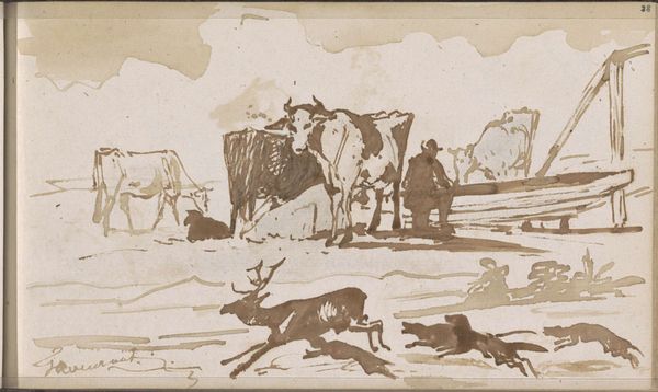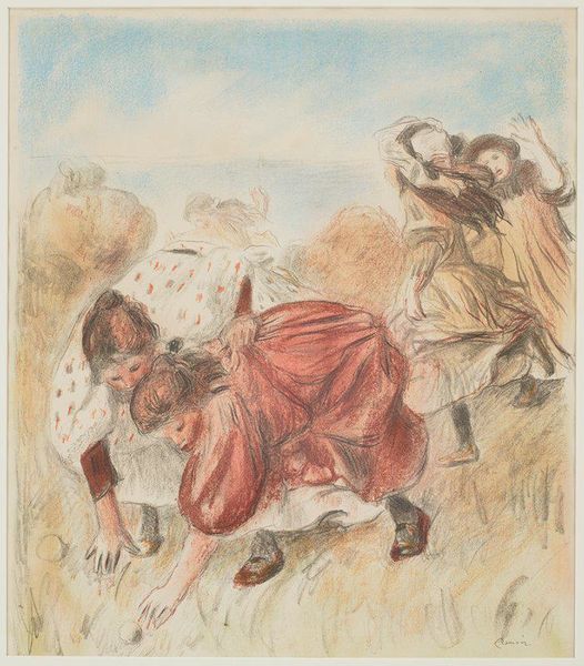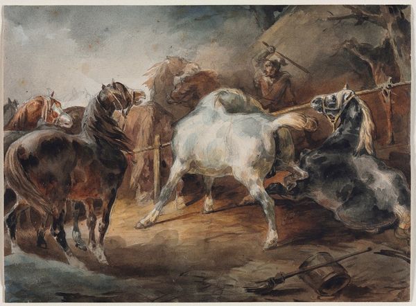 Editor: So, this is Fletcher Martin's "Untitled (Steer Wrestling at a Rodeo)" from around the 1940s. It seems to be oil paint, maybe even a print? It feels very dynamic and raw, a snapshot of a chaotic rodeo scene. What are your thoughts on this piece? Curator: The apparent "rawness" strikes me, too. Let's consider the materials used. Oil paint, applied in broad strokes, suggests a direct, unmediated process. It attempts to depict immediacy but remember, that is just an affectation. Now, factor in that it may be a print - This raises interesting questions about reproducibility and accessibility of art depicting the working class at play, in this case rodeo culture. Editor: So, it's not just about the *image* of the rodeo, but about how that image was made and circulated? Curator: Precisely. Think about the layers of labor involved, not just the rodeo rider’s physical exertion, but also Martin's artistic labor and the printer's if it is, indeed, a print. How does the process itself contribute to the artwork’s meaning? And how does reproducing this as a print broaden its reach and, possibly, cheapen its inherent value? Editor: I hadn't really considered that! It makes me wonder about who the intended audience was and how much they would be involved in the labor this piece represents, and what that represents. Curator: It complicates any romanticized vision of the American West, doesn't it? It shows the spectacle, but also the industry. Martin asks us to contemplate labor itself. We begin to think not just what we see, but how we consume. Is the pleasure extracted through viewing or active participation and, what are the hidden implications. Editor: That definitely gives me a new perspective to approach the piece from. I'll certainly be thinking about production and viewership differently from now on.