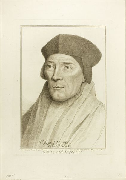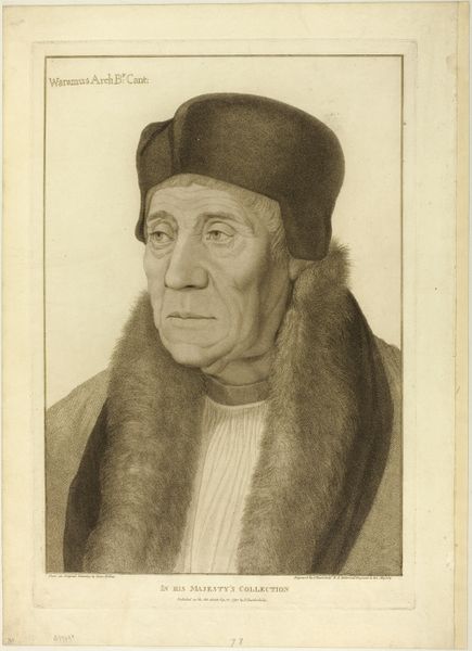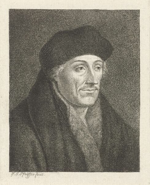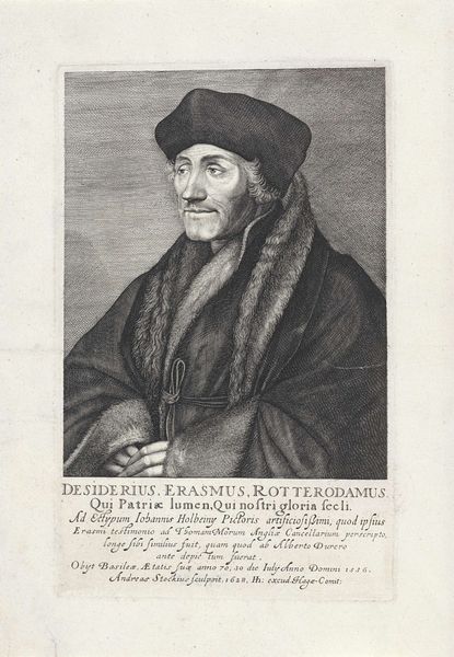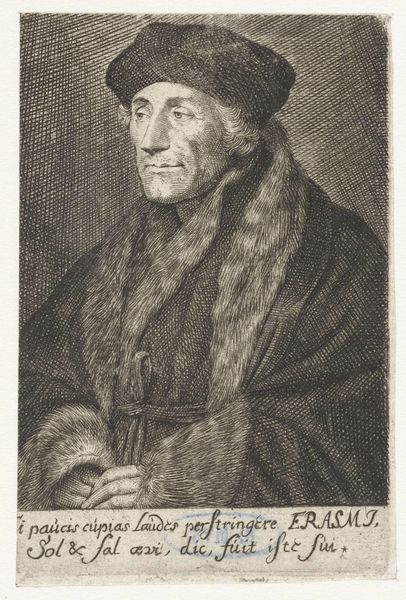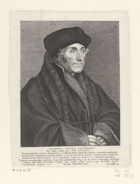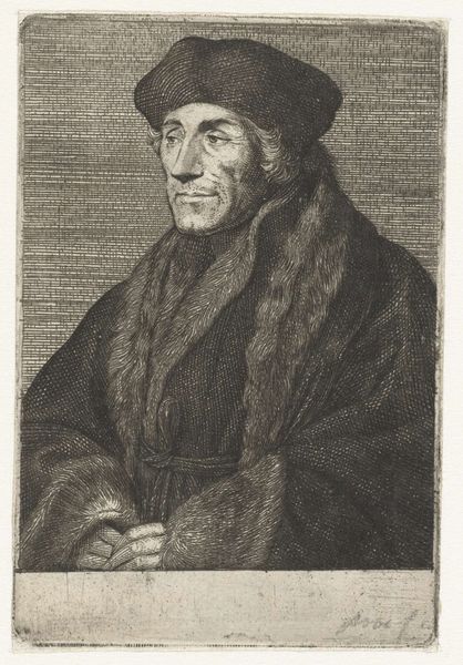 Curator: Edme de Boulonois created this engraving, "Portret van Desiderius Erasmus", in 1682. The work employs the intaglio technique on a printed surface. Editor: It has this very severe, almost academic air about it. The subject seems a bit burdened by all those heavy robes. Curator: Well, Erasmus, as a humanist scholar, occupied a weighty position in society. This piece reflects the visual language of power and intellect during the Baroque era. We can see the socio-political role of portraiture emerging here. Editor: Exactly. Portraits always carry that baggage of social status. It is like, what narrative does the subject project to others? I cannot help but wonder how much control Erasmus had over this visual representation. Did he consciously agree with such presentation of authority? Curator: Interesting point. He was an advocate for religious reform and intellectual freedom, and the image aligns him with the elite. But considering the turmoil of the Reformation, positioning oneself as a figure of authority might have been strategically important for Erasmus, considering both personal safety and promotion of his intellectual work. Editor: It's almost as if he is performatively wearing the trappings of power, rather than truly embodying them. There’s something detached in his eyes, at odds with the fur-lined coat, hinting at some kind of complicated tension there. I want to consider him beyond this single visual point of view and hear his counter narrative against it. Curator: This speaks to how identity is constructed, both individually and through societal lenses. And this intaglio print made the image of Erasmus accessible. What were the circulation strategies? What kind of public did it serve? Editor: The ability to disseminate one's image through print—powerful for crafting and controlling public perception, like a proto-PR campaign! Thanks to art history for keeping track of these early marketing efforts! Curator: I appreciate how this artwork reveals the negotiations of identity, power, and representation in the Baroque world. Editor: Absolutely. The visual politics here continue to provoke reflection.