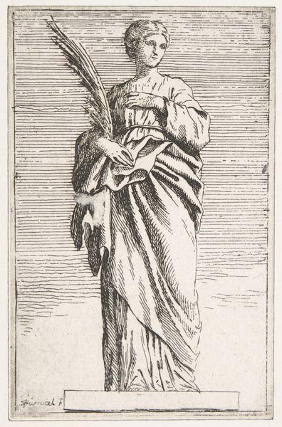 Editor: Right, next up we have a print called "Standing Soldier, facing right" by Melchior Lorck, from 1576. The medium is listed as woodcut. I find it really striking - almost severe. The detail is incredible for a print, particularly the texture in the clothing. What's your take on it? Curator: Well, placing it in its historical context, it's crucial to remember the 16th century was a period of intense cultural exchange and conflict between Europe and the Ottoman Empire. Lorck, significantly, served as an envoy to the Ottoman court. This print, likely part of a series, is not just a depiction of a soldier. It's a document, almost an ethnographic study made for a European audience hungry for information about the "exotic" East. Do you see how carefully Lorck renders the details of the turban, the weaponry, the shield? Editor: I do. It's very precise. So it's less about glorifying war, and more about documentation? Curator: Exactly. The Northern Renaissance was very much concerned with a faithful rendition of reality, of using art for scholarly pursuits. Prints were a perfect medium for disseminating information. Who would have been the primary audience for something like this, do you think? Editor: Probably other artists, scholars, maybe even political figures? Someone who'd want a reliable image of an Ottoman soldier, but perhaps wouldn’t be traveling to Turkey themselves? Curator: Precisely! And the circulation of these images had a profound impact on European understanding—or misunderstanding—of the Ottoman world. What do you make of his stance, though? It doesn’t seem particularly…threatening. Editor: No, not at all! He almost looks like he's posing for a photograph. That definitely brings the "documentation" idea home, it's meant to record, not to provoke an emotional response. I didn't realize there was so much wrapped up in this single image! Curator: And that's the beauty of art history! Everything is connected, socially, culturally, politically. It makes you consider the motivations and implications behind artistic choices.
