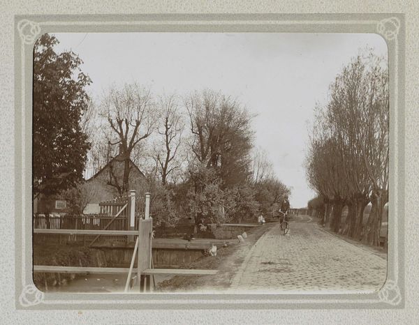 This photograph of a farm with a drawbridge over a ditch was captured by Folkert Idzes de Jong. The sepia tones and soft focus give a dreamlike feel to the scene. The image is structured by strong horizontal lines, notably the ditch, the horizon, and the bridge itself, which create a sense of depth. The composition is further divided by the vertical elements like the trees lining the path and the reeds in the foreground. This interplay between horizontal and vertical lines creates a grid-like structure, a common strategy used to organize pictorial space. Here, De Jong uses a subdued palette to emphasise the textural contrast between the thatched roof of the farmhouse and the smooth surface of the water. This formal strategy might reflect early 20th-century debates about the relationship between nature and culture, questioning the boundaries between the constructed and the organic. How might this formal structure reflect broader cultural concerns? This remains open to our ongoing interpretation.