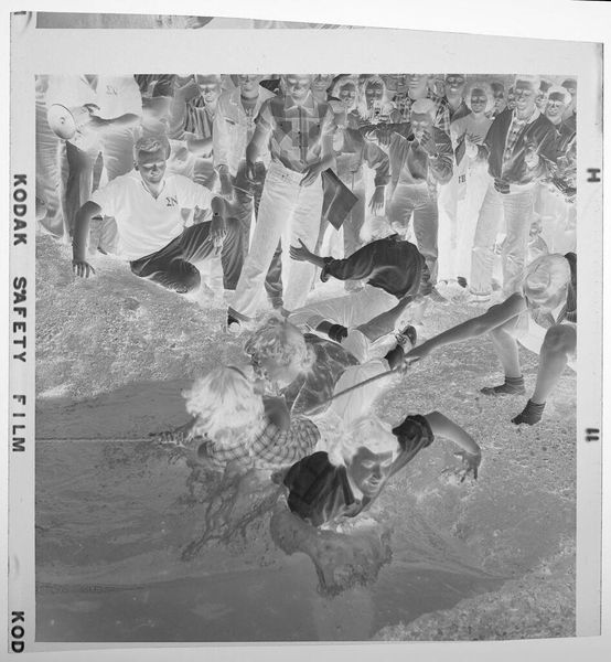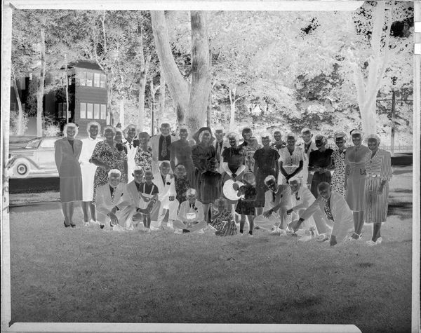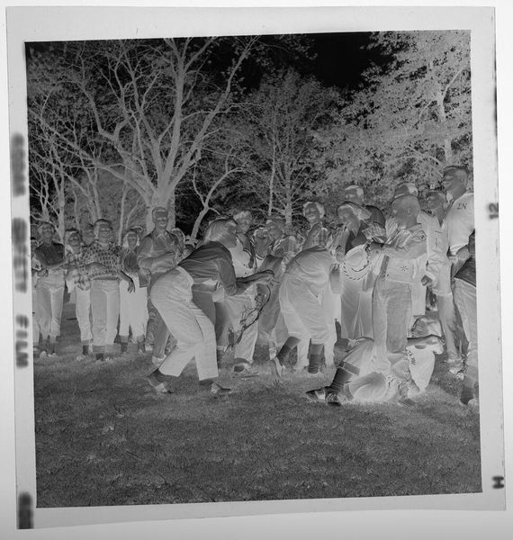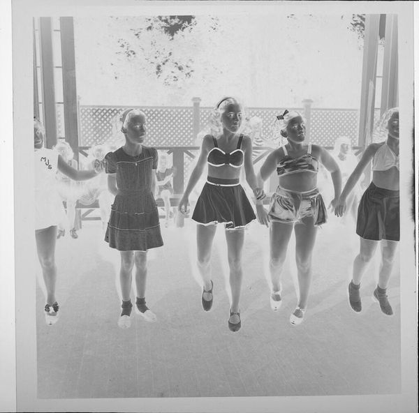 Editor: This intriguing photograph by Jack Gould captures a line of children waiting, perhaps a bit anxiously, for a theater audition. The reversed tones give it a dreamlike quality. How do you interpret this poignant scene? Curator: It speaks to that universal experience of childhood anticipation, doesn't it? The reversed image almost makes them ghosts of performances yet to come. It makes me wonder about the artist's intention and makes me feel wistful. Editor: I agree. The ethereal quality really heightens the emotional impact. Curator: Perhaps it mirrors our own memories, inverted and slightly out of reach. Like half forgotten dreams.