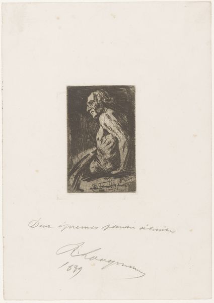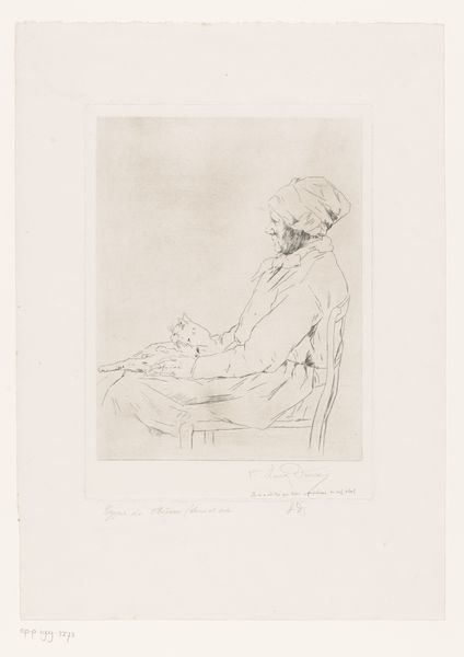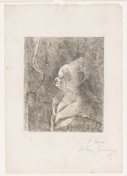 Editor: Here we have Anders Zorn's "Mme Georges May II" from 1891, a print made using etching on paper. I'm struck by the textures – the fur, the frills, even the way the light hits her face is conveyed through such intricate lines. What's your perspective on this particular piece? Curator: This etching gives us a glimpse into the material world of 19th-century Parisian society. Zorn, through the labor-intensive process of etching, has rendered not just the likeness of Mme May, but also the very fabric of her social standing. Look closely: the density of lines suggests the richness of her furs and fabrics. What does this signify about production, labor and value at the time? Editor: It really does emphasize the value placed on material possessions as markers of status. The fact that it's an etching too—a process involving skill and time—seems to elevate the subject further. Curator: Exactly. Consider the circulation of prints in the 19th century. It’s not just about aesthetics; it is about reproducing and distributing a certain image of wealth and power, available to the wider market of art consumers. Do you think it's an accessible portrayal? Editor: I see what you mean; it allows a wider audience to consume, if not possess, a symbol of luxury and affluence. Although technically reproducible, the skills of the artist are critical, embedding value within. Curator: Precisely. So, thinking about both the materials—the paper, the ink, the very plate used for etching—and the processes, we reveal a network of labor, production, and social messaging. Editor: I hadn't considered how deeply ingrained the materials and process are with communicating social status! Thank you. Curator: It reveals so much, doesn't it?