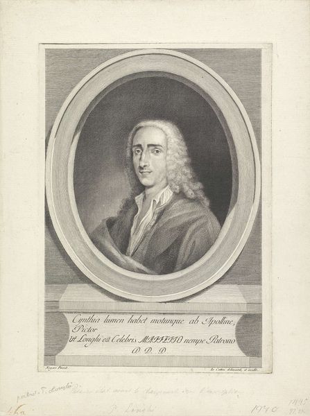 Here is a self-portrait etching by Aert Schouman, an artist working in the Netherlands during the 18th century. Schouman lived during the Dutch Golden Age, a period marked by economic prosperity, artistic innovation, and also deeply rooted social hierarchies. As we observe Schouman's self-representation, we see how he presents himself within these dynamics. Framed by an oval of leaves and drapery, Schouman is depicted with the tools of his trade, brushes and palette, signaling both his profession and artistic skill. He is wearing a simple coat and long curly wig. Schouman's choice to portray himself as a refined and skilled artist reflects the aspirations and realities of middle-class artists navigating a society still influenced by old aristocracy. This self-portrait serves not only as a representation of Schouman’s identity but also a statement about the evolving social status of artists during this time. It's a subtle yet powerful negotiation of personal identity within broader social structures.