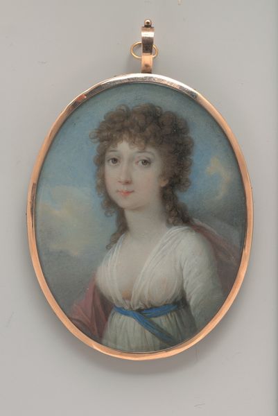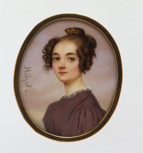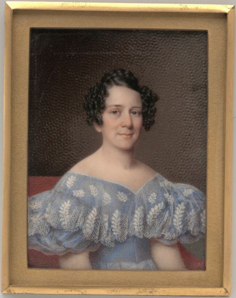Editor: We’re looking at Henry Inman's "Portrait of a Lady," dating from around 1825. It’s a delicate miniature, watercolor on ivory, housed here at the Met. I'm really struck by the detail he achieves, especially given the scale. What catches your eye about it? Curator: The material processes are fascinating here. Forget the idealised romanticism; I see the artist's labor. Consider the ivory support – where did that come from? The violent extraction, the trade routes, the social hierarchies enabling its acquisition. Then, the watercolor itself: pigments painstakingly ground, bound, applied with meticulous precision. This wasn’t just artistic inspiration; it was a *craft*, tied to global resource chains and the patronage system. Editor: So, you're thinking less about the sitter and more about what it took to *make* the artwork itself? Curator: Precisely. Who was commissioning these miniatures? What did owning this signify in terms of class and social status? Think about the frame too - the gold leaf, another layer of extraction and exploitation. These objects are embedded in networks of power and commodity exchange. How does that knowledge affect your interpretation of her placid expression? Editor: I see what you mean. Knowing the cost – literally – of creating such an intimate object adds a certain weight. It feels less like a sentimental keepsake and more like a statement of wealth. Curator: Exactly. The materials *speak*. And they whisper tales of the economic realities that underpin seemingly beautiful artworks. I keep wondering about the person responsible for meticulously painting this artwork with such refinement! Editor: That's given me a whole new perspective. I’ll definitely look at materials in a different light from now on. Curator: Me too.
