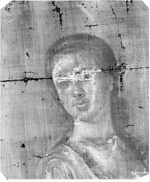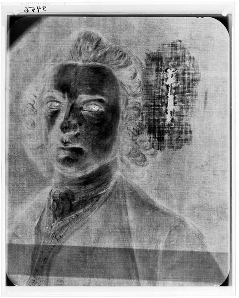 Curator: This is an X-radiograph of "Benjamin Hallowell," a portrait by John Singleton Copley. It gives us a glimpse beneath the surface of the artwork. Editor: It's like looking at a ghost. The cracks create this web-like structure over the image, like a shattered mirror reflecting a historical figure. Curator: Indeed. Radiography allows us to examine the materiality of the painting. We can see the density of the paint layers, preparatory sketches perhaps, and evidence of the artist's process. Editor: It's fascinating to consider what the act of revealing unseen layers does to our understanding of portraiture and how the sitter's social status might be implicated in this revelation. Curator: It offers a fresh perspective, almost a scientific lens, through which to examine the construction and subsequent reception of the work. Editor: Exactly. It makes us reflect on both the physical object and its cultural afterlife. Curator: A potent reminder that even the most familiar images contain hidden complexities. Editor: It invites us to consider the role of science in deconstructing notions of wealth and power.