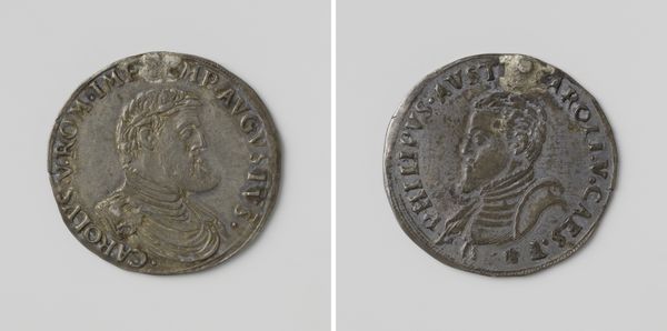 Curator: Let's examine this intriguing Northern Renaissance piece—a medal made of metal, dating back to 1536. It's a relief depicting "Maria van Hongarije, landvoogdes der Nederlanden"—Mary of Hungary, Regent of the Netherlands. Editor: Immediately, the stark profile view and somewhat austere attire of Mary strike me as an interesting contrast to the lush allegorical scene on the reverse. There’s a tension between her controlled image and the narrative unfolding behind. Curator: Precisely! This juxtaposition serves a very specific purpose. Portrait medals such as these became fashionable among European elites, tools to disseminate power and project particular virtues or qualities about the sitter. Her solemn visage reinforces her authority and capability in governance, within a politically volatile period in Europe. Editor: Yet the presence of the allegorical figure—a nude female figure is not very austere!—suggests something deeper, perhaps even vulnerability or a reliance on concepts like Fortune to guide her reign. Considering that Mary was a powerful female leader within a male-dominated landscape, one must consider the intended audience for the artwork. Curator: Context is crucial, as always. This medal coincides with a pivotal period where Mary of Hungary wielded significant influence on behalf of her brother Charles V, Holy Roman Emperor. These were objects carefully crafted to emphasize not only lineage but also fitness for rule. How else do we grapple with this seeming tension between figure and background? Editor: Well, is it possible this wasn't purely for external propaganda, that this medal also functioned for Mary herself? Perhaps a physical representation of her internal struggle balancing familial expectations and inherent agency, represented in the two sides. She had, after all, inherited some complicated shoes to fill, following her aunt, Margaret of Austria in the regency position. Curator: A nuanced perspective, grounding the reading within intersectional narratives. Furthermore, such medals often referenced classical themes to further ennoble their subjects. The landscape and reclining nude might echo familiar Renaissance tropes intended to emphasize both cultured tastes and enduring dynastic strength. Editor: And while art history is rich in its details and history, it must always remember its social functions. It humanizes a figure who would otherwise remain only the name of an institution or state. It speaks volumes about gender, class, political authority, even something as deceptively modest as the materials and function, not merely its beauty. Curator: Indeed, looking at the medal in this light, it reveals so much. From power to fragility, Northern Renaissance art gave us a powerful insight into the cultural politics of leadership, with careful craftsmanship that is telling of Mary and the circumstances surrounding the sitter.